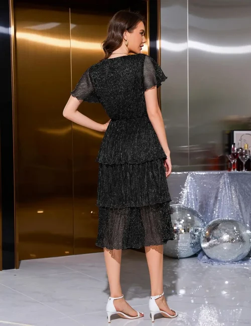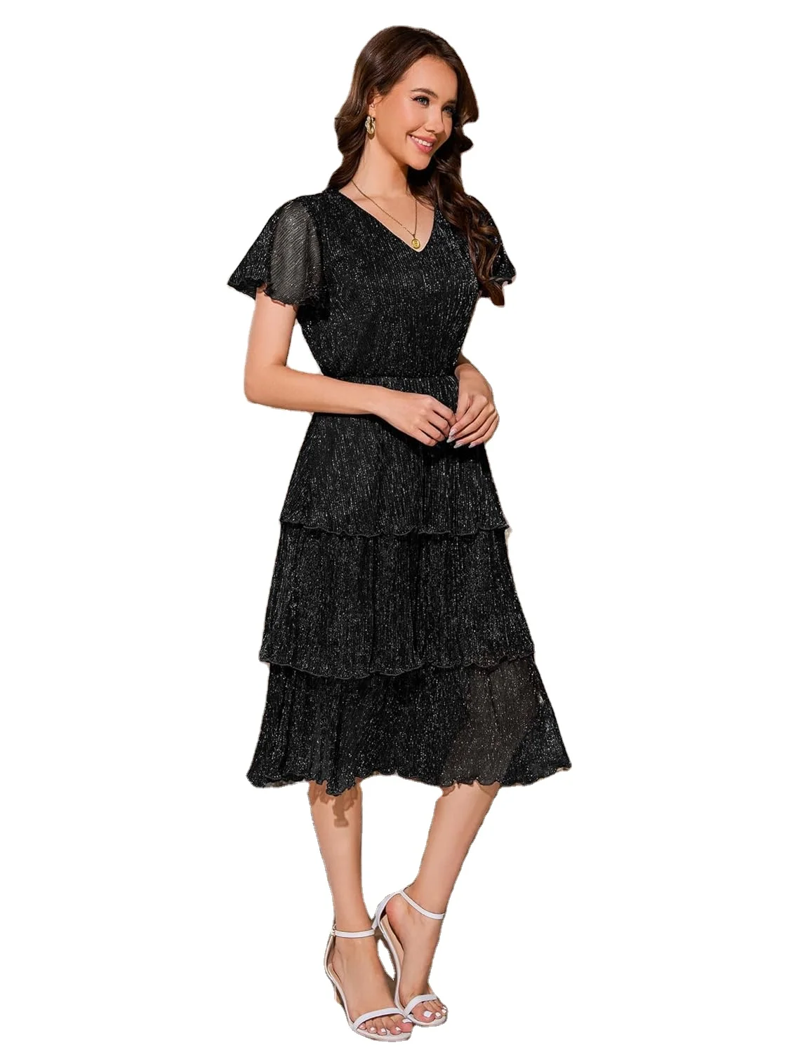 Product Name: Dressystar Women’s 2025 Solid Chiffon Cocktail Dress Glitter Midi Length Short Sleeve V-Neck Natural Waist Ruffle for Party