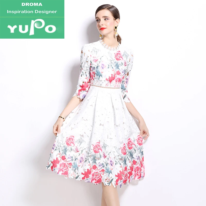 Product Name: Droma in Stock Fashion Vintage Hollow Out Lace Midi Length Floral Casual Dresses Elegant Women Lady
