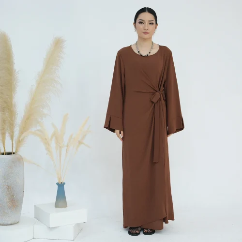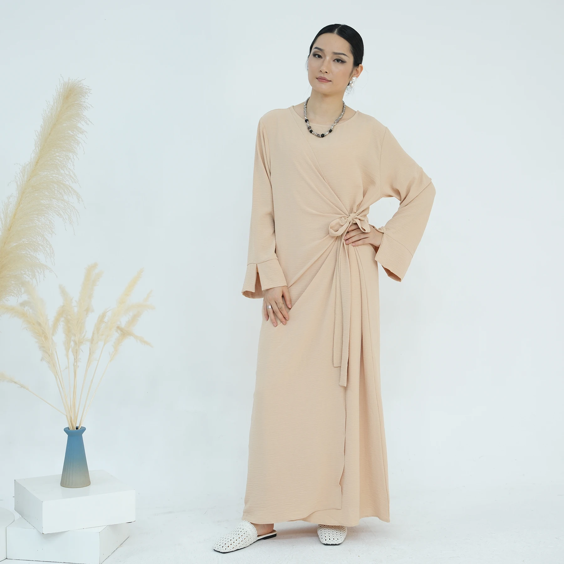 Product Name: Dubai Abaya Manufacturer Elegant Casual Wear Tie Belt Wrap Long Dresses Solid Color Slit Sleeves Modest Abaya Women Muslim Dress