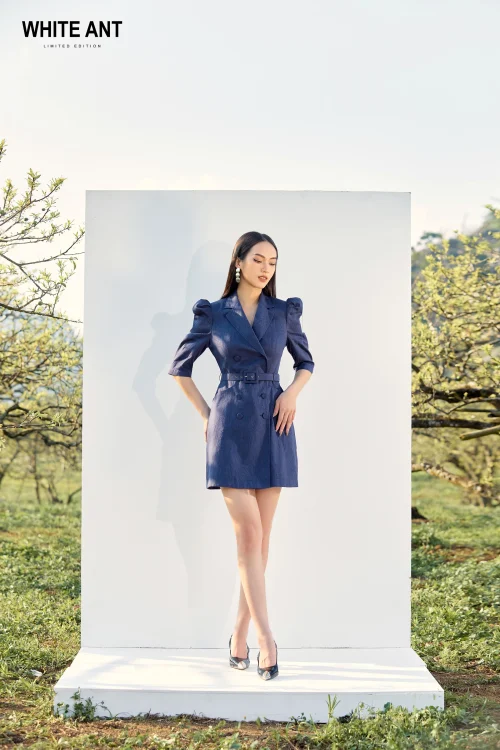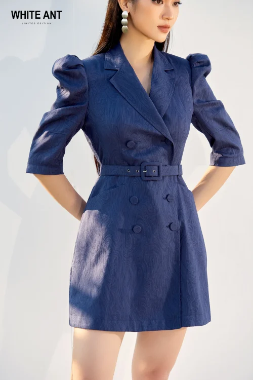 Product Name: Eco Friendly Stylish Organic Cotton Blue Lapel Collar Dresses With Waist Belt Jacquard Dresses Women Lady Elegant Button Decor