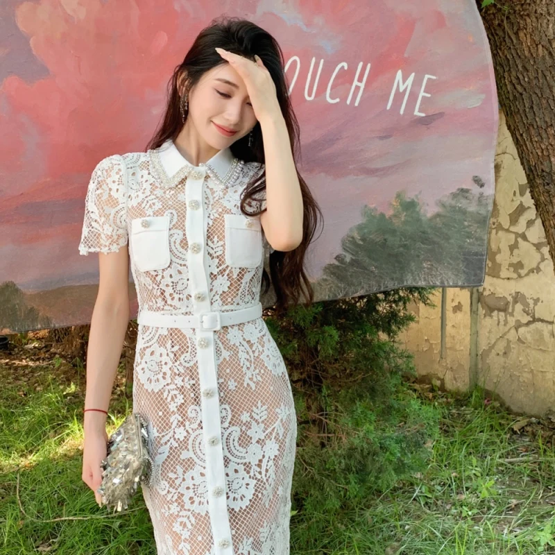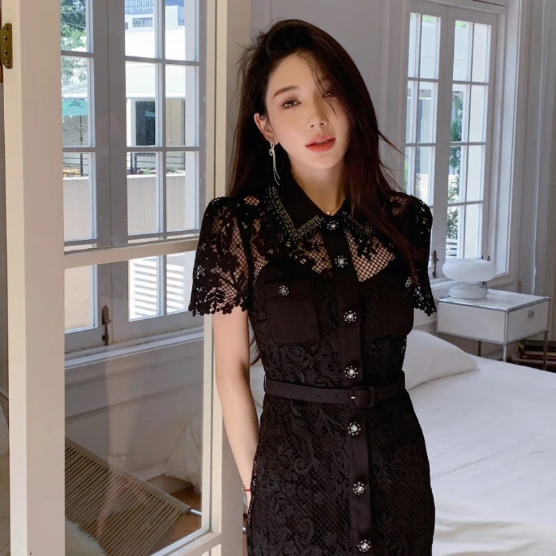 Elegant Black White Temperament Hand-nailed Beaded Lapel High-waisted Slimming Dress 2024 Bettergirl Lace Two-piece Set Women