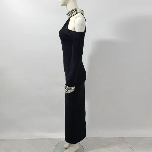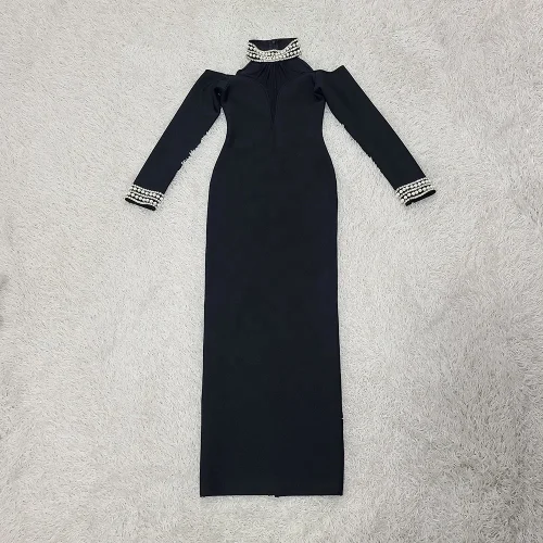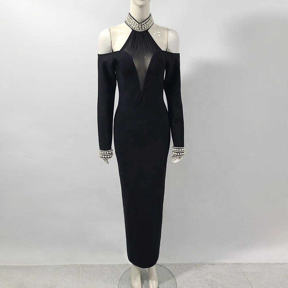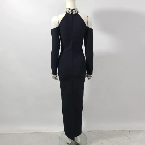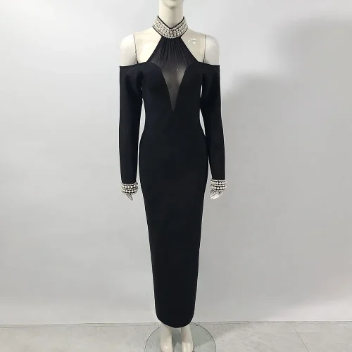 Product Name: Elegant Diamond Mesh Off the Shoulder Long Sleeve Sexy Bandage Maxi Dress for Women Evening Party Gown Autumn Winter New