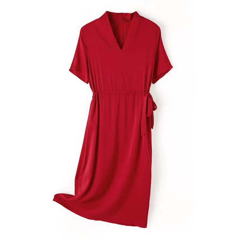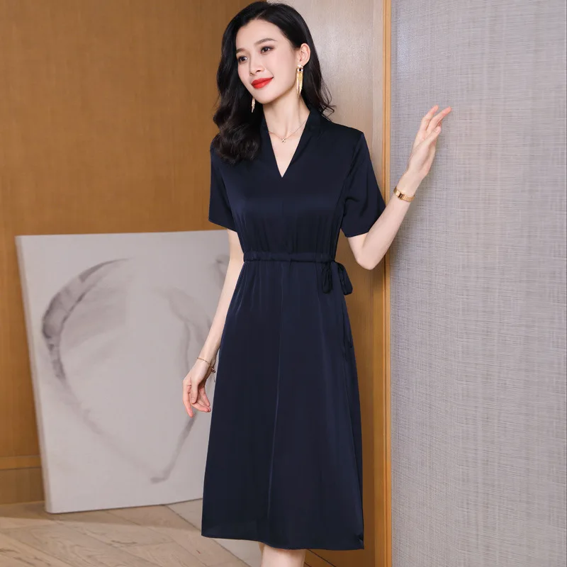 Product Name: Elegant Korean-Style Short-Sleeved Silk Dress Solid Color and Slimming for Ladies Natural Waistline