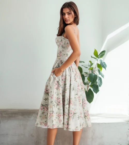 Product Name: Floral Print A-Line Midi Dress for Women Elegant Summer Sundress with Slender Fit and Spaghetti Strap Sleeves