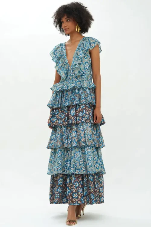 Product Name: Holiday Wear Collection Latest Women Dress Deep V-Neck Sexy Women Resort Wear Ruffle Dress Floral Printed Women Long Maxi Dress