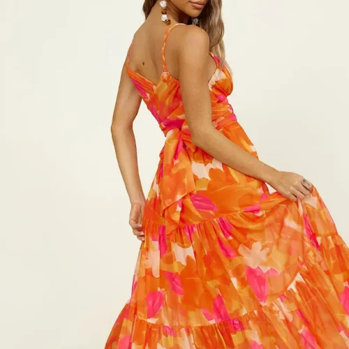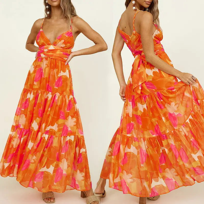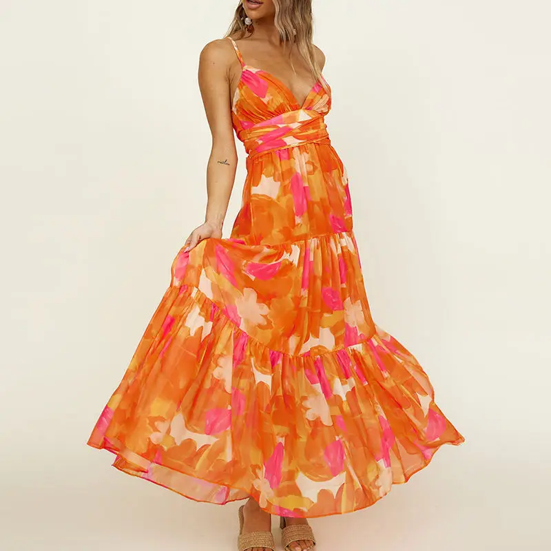 Product Name: Ladies Bohemian Fashion Sexy Elegant Beach Chiffon Floral Long Dress Summer Boho Casual Maxi Boob Slip Dress for Women