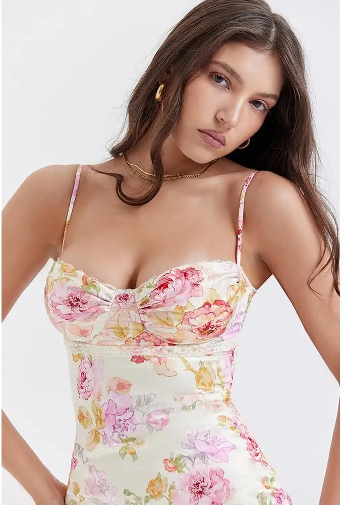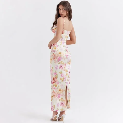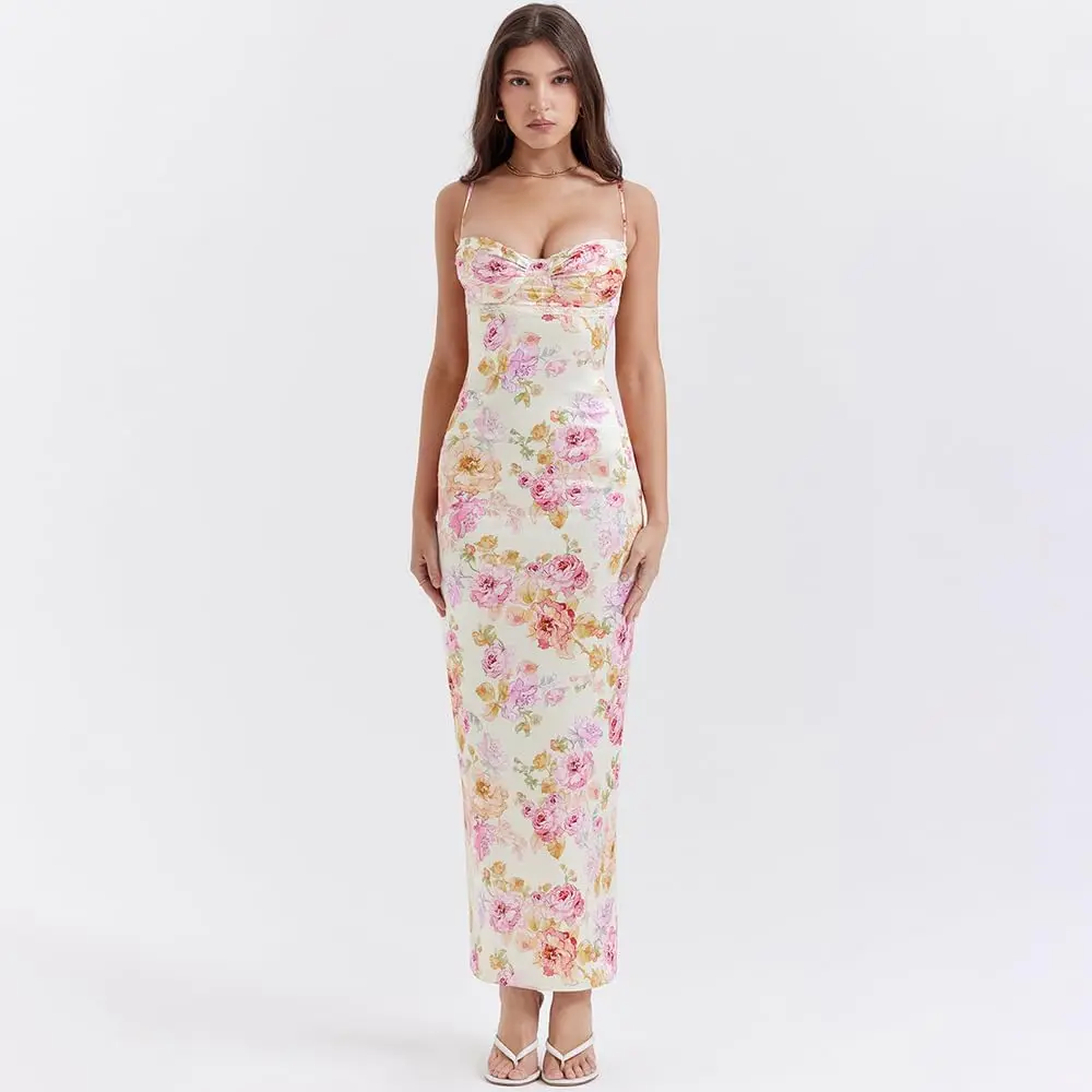 Lady’s Floral Satin Bodycon Maxi Dress Casual Wedding Guest Formal Sundress Summer Floor-Length Digital Printing Lace Decoration