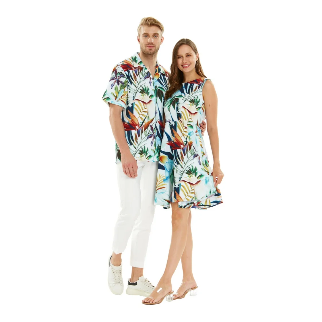 Product Name: Matchable Couple Gift Hawaiian Luau Shirts for Men and Women’s Vintage Fit and Flare Sundresses with Pocket in Lost in Paradise
