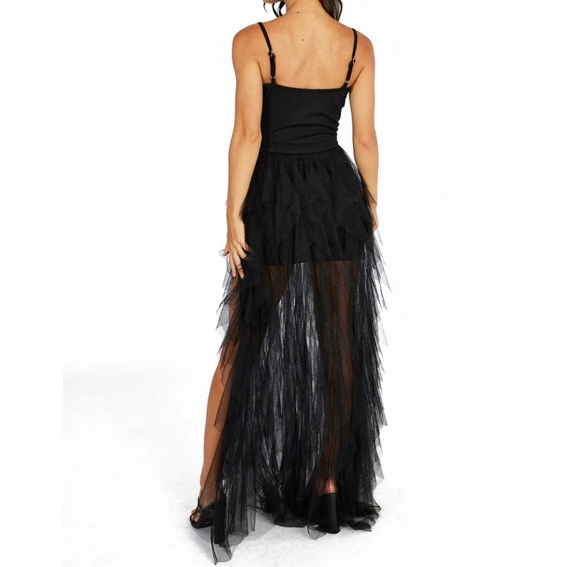 New Design High Quality Women’s Plunging Neck Black Tulle Maxi Dress Tiered Ruffle Strappy Summer Dress