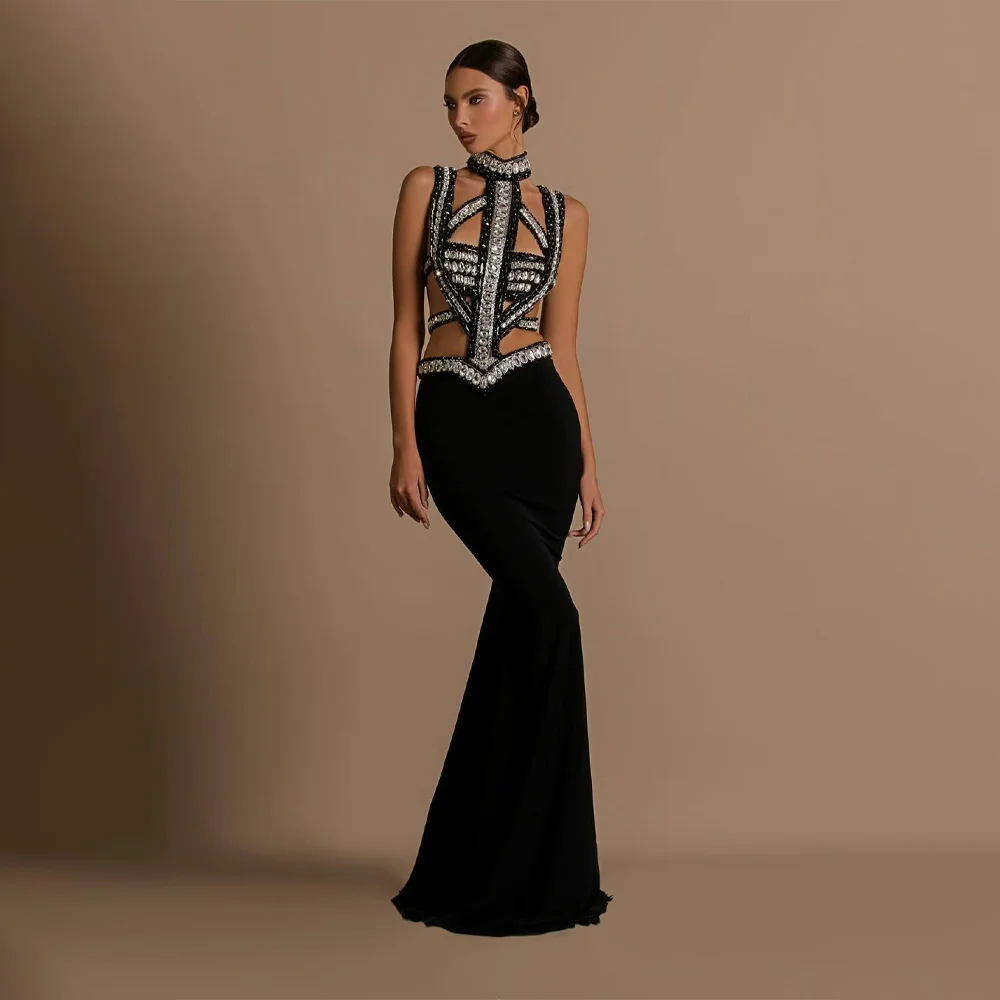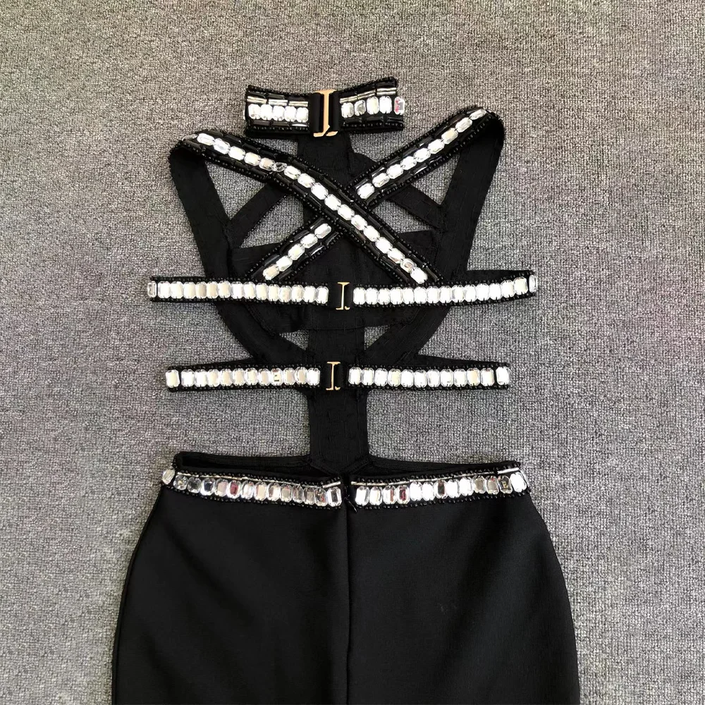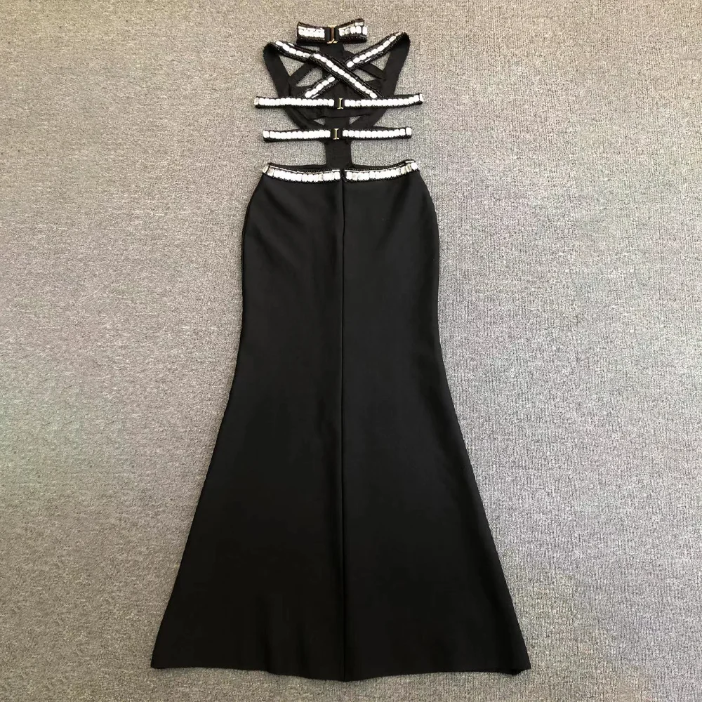 Product Name: New Design Sexy Cutout Backless Slim Black Bandage Dress Nightclub Party Dress Black Sexy Cutout Rhinestone Women Maxi Dresses