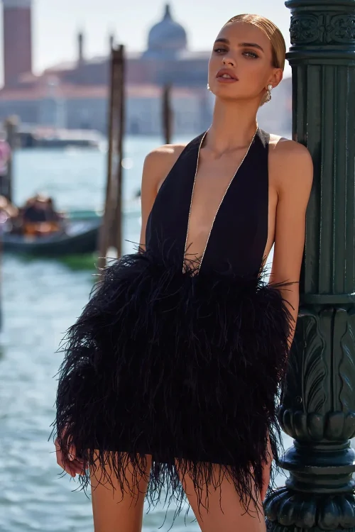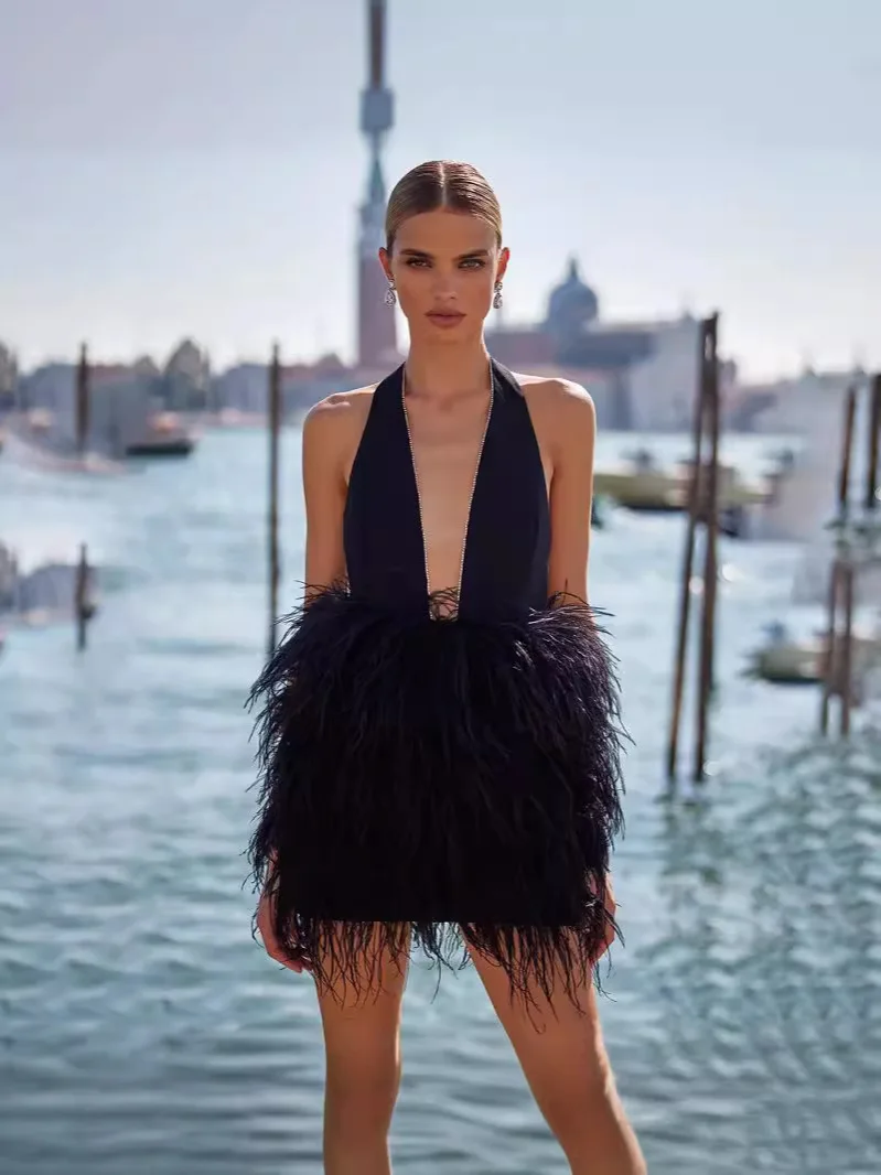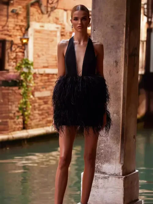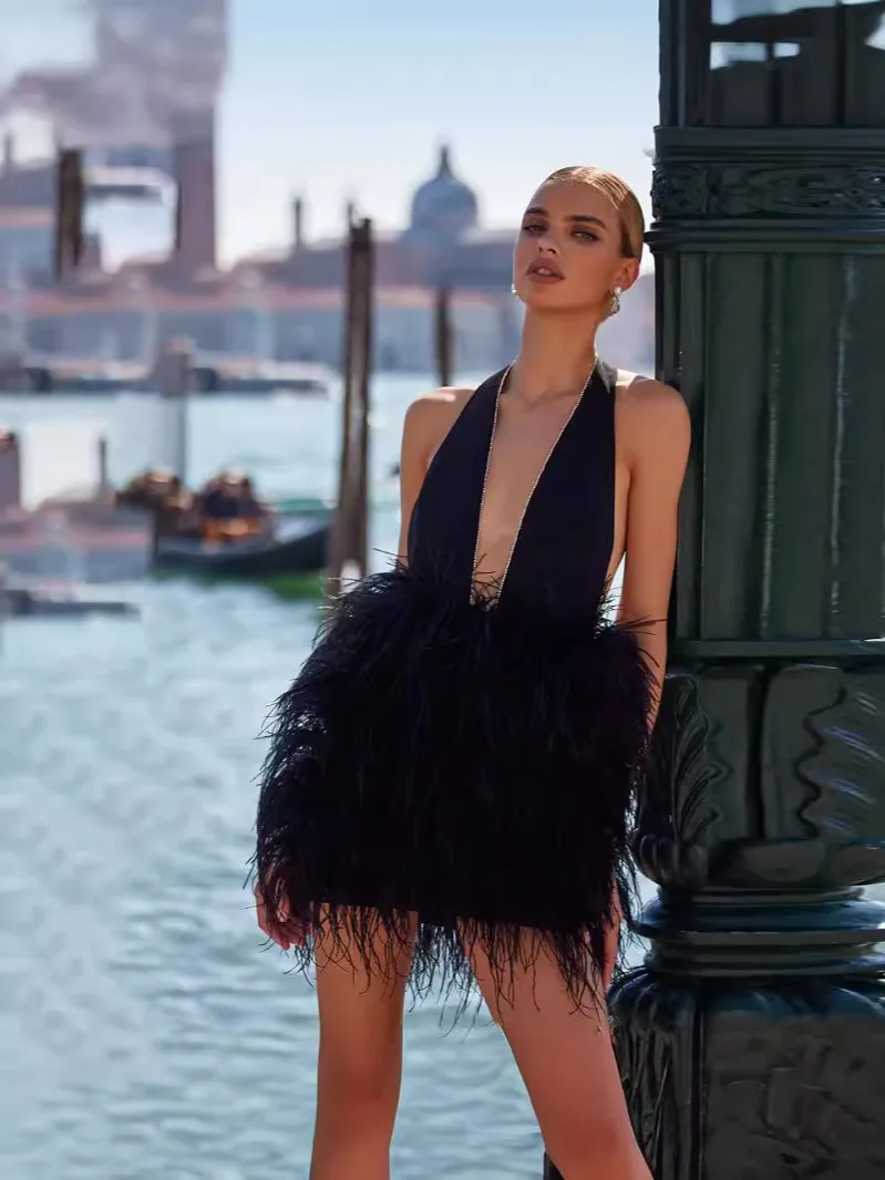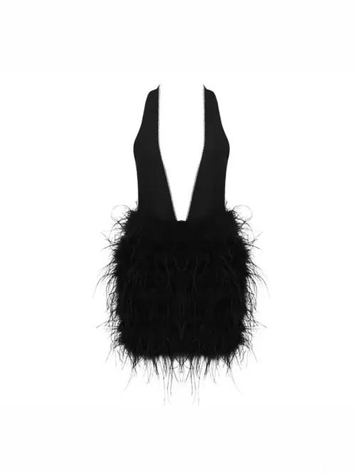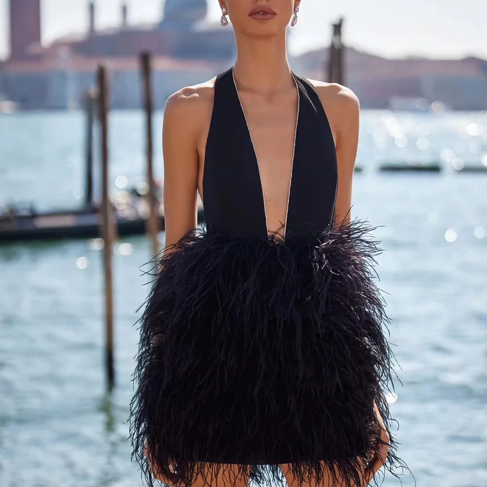 Product Name: New Fashion Summer Women’s Patchwork Deep V-Neck Feather Hanging Backless Club Short Dress