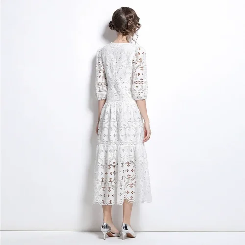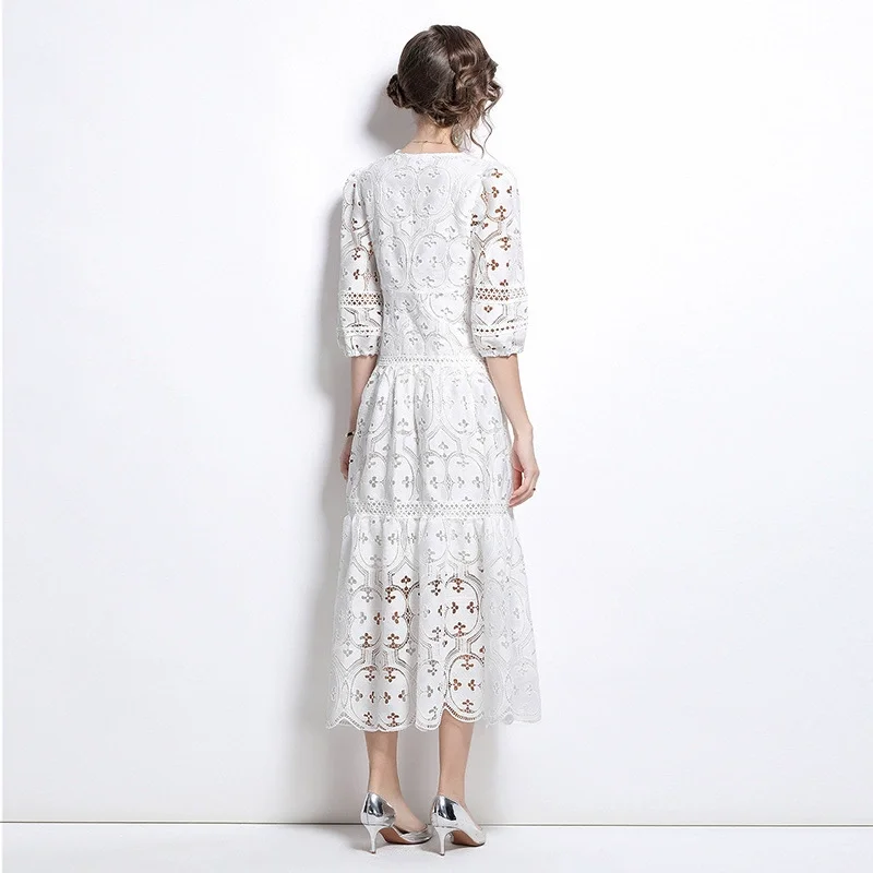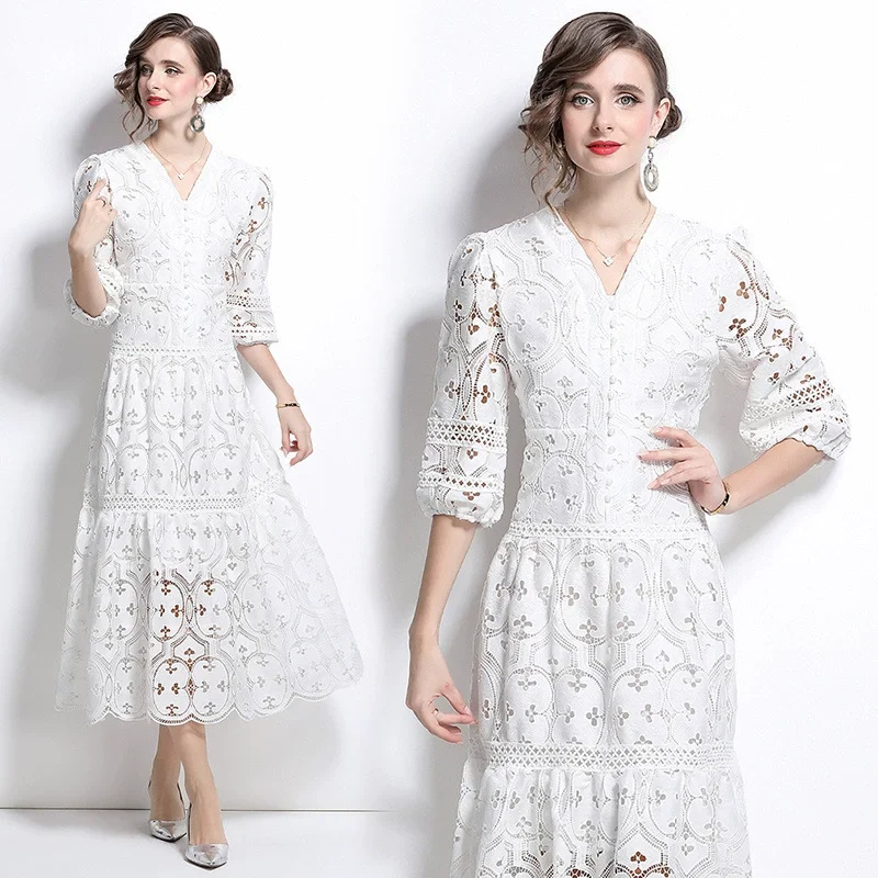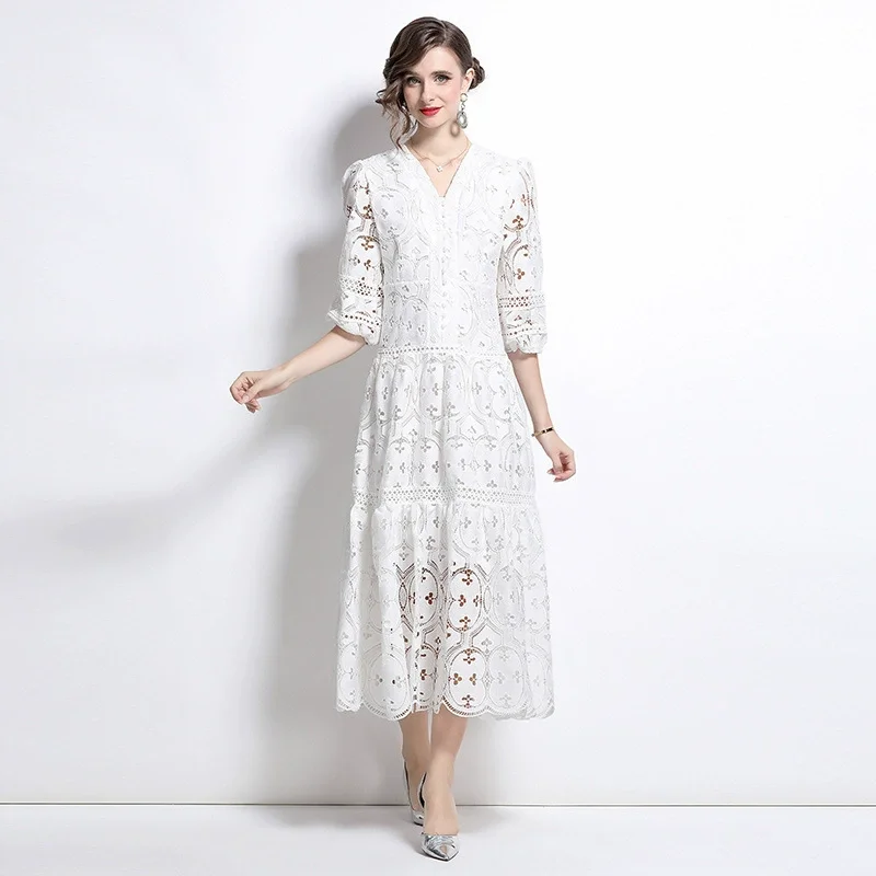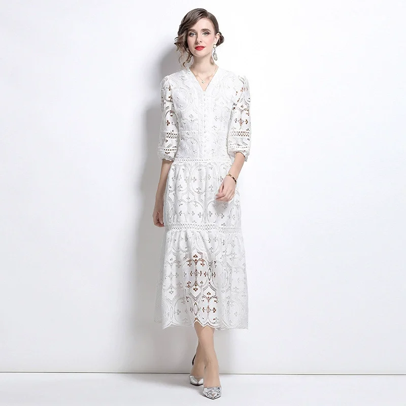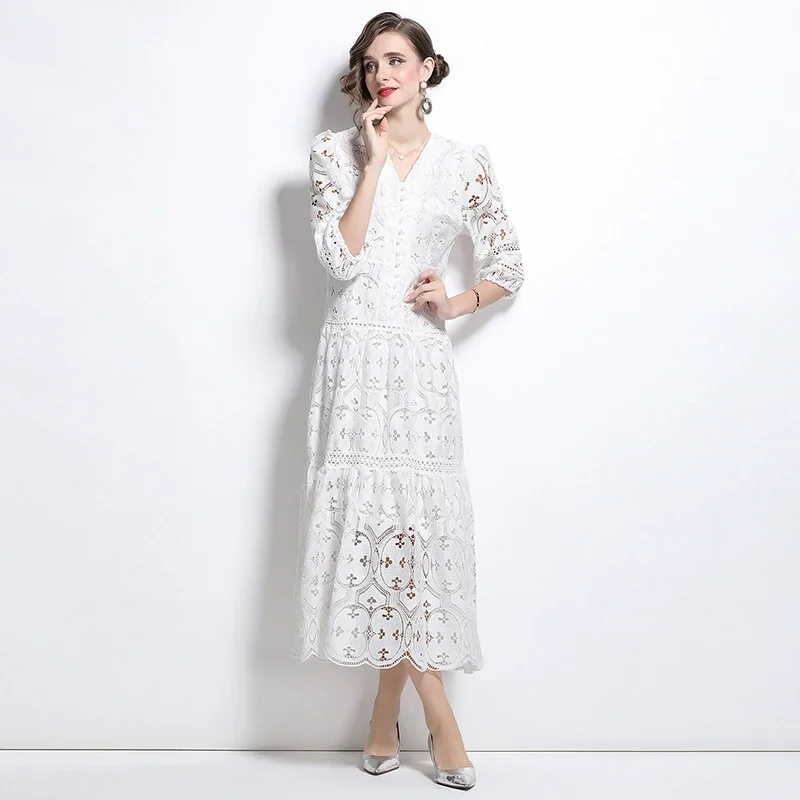 New Female French Senior A-Line Long Dress with 3D Pattern Thin Hollow V-Neck for Spring and Fall Parties Vacation Style