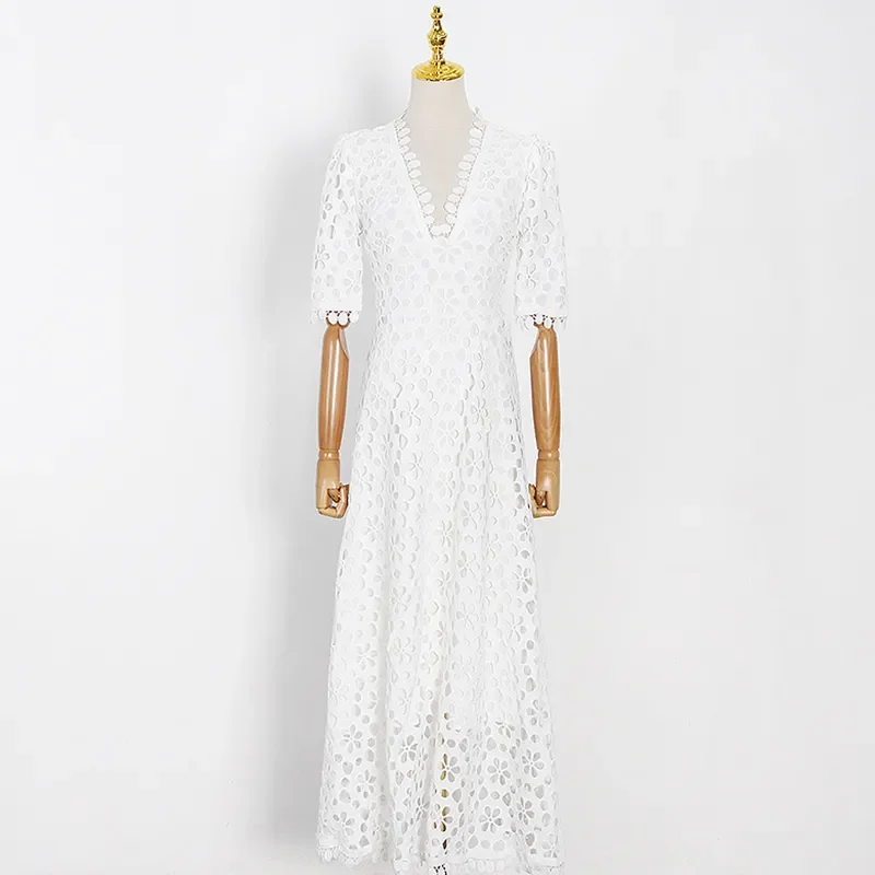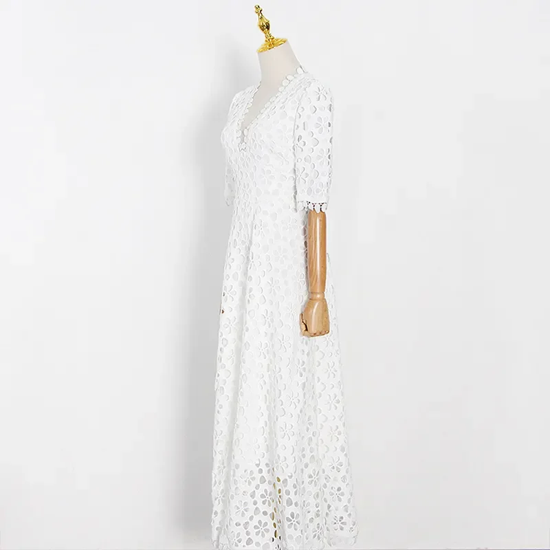 Product Name: New Femininity French Style Luxury V-neck Half Sleeve White Swing Hook Flower Women Aline Casual Hollow Elegant Lace Lady Dress