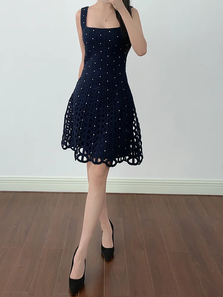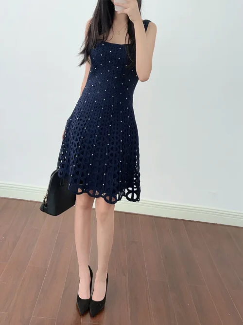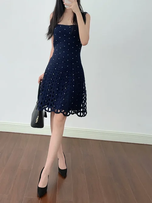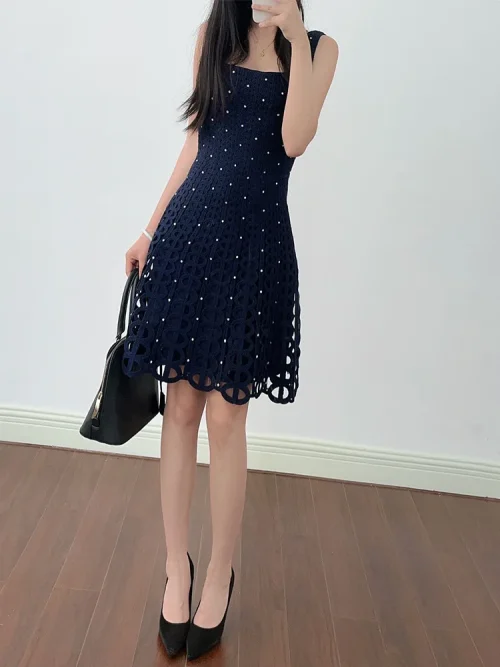 Product Name: New French Design Elegant Fashion Women Dress Black Sleeveless square Neck Wave Point Waist A-line Stylish Elegant Dress