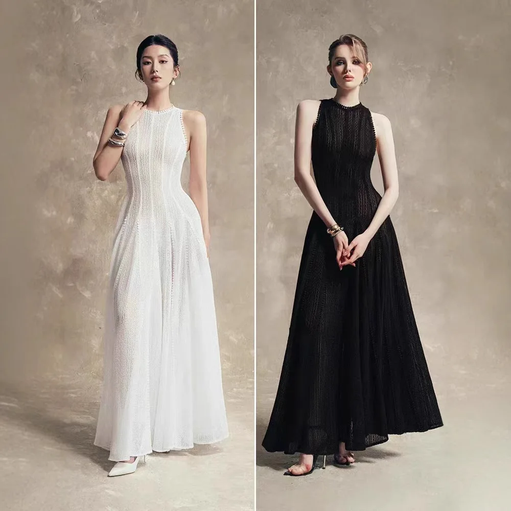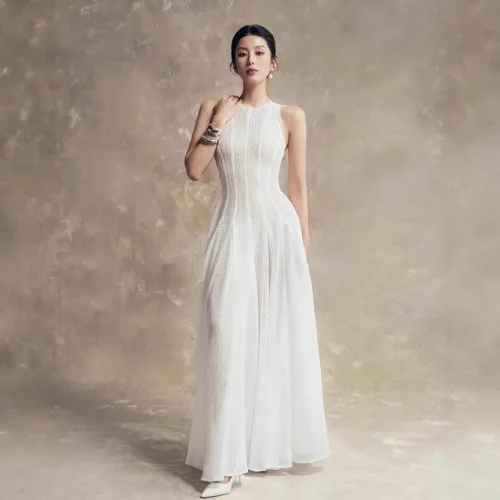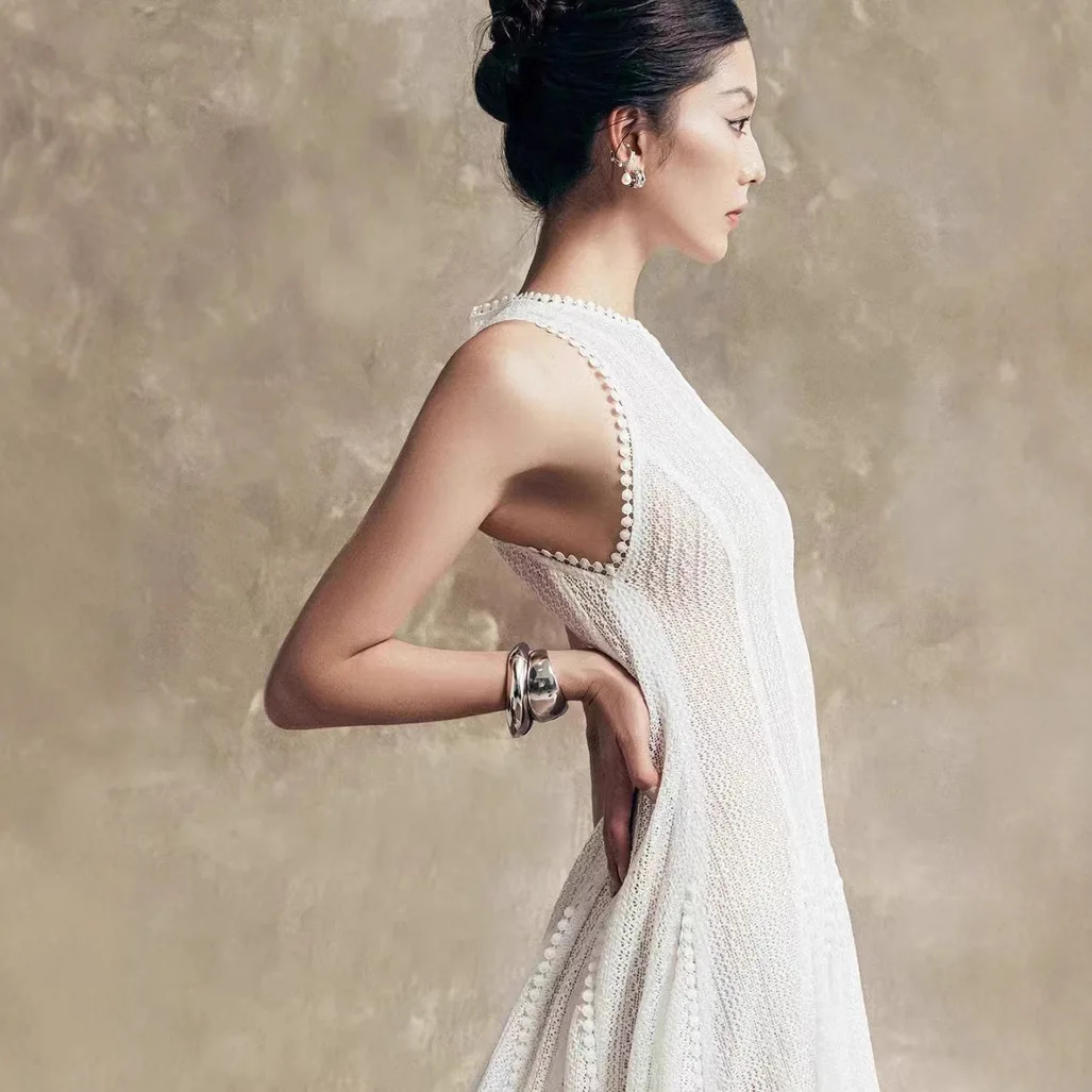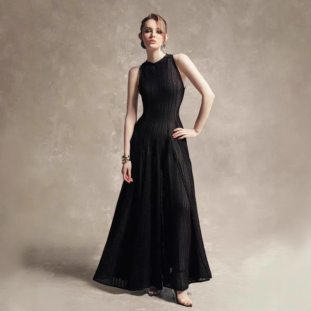 New Ladies’ Dress Temperament Waist Cinching Long Skirt Retro Hollow Lace Sleeveless Vest Dress