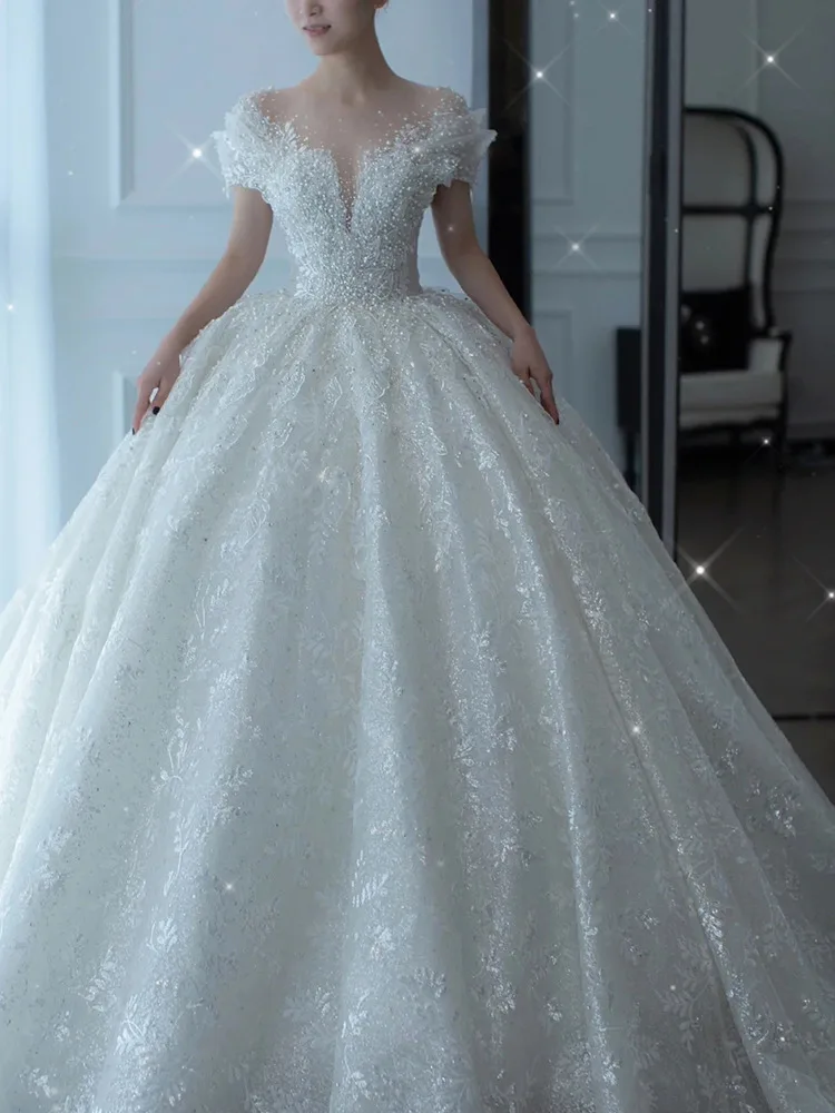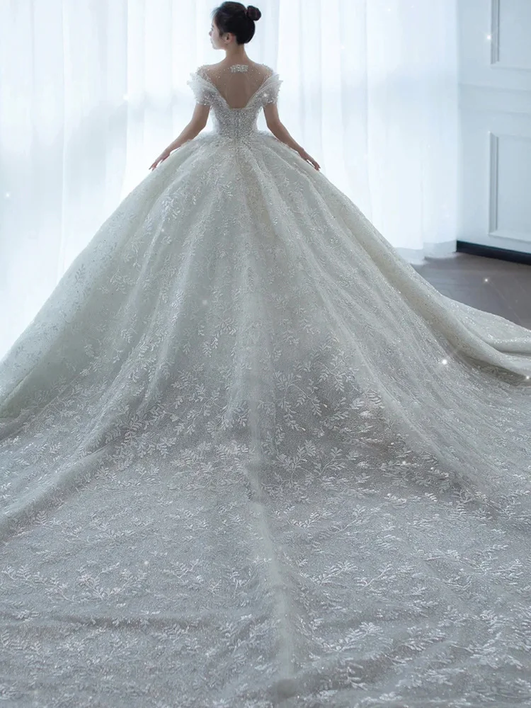 Product Name: New Luxury Off Shoulder V-neck Sexy Lace Applique Princess Bridal Gown Pearls Wedding Dresses