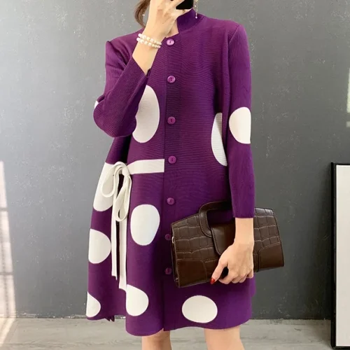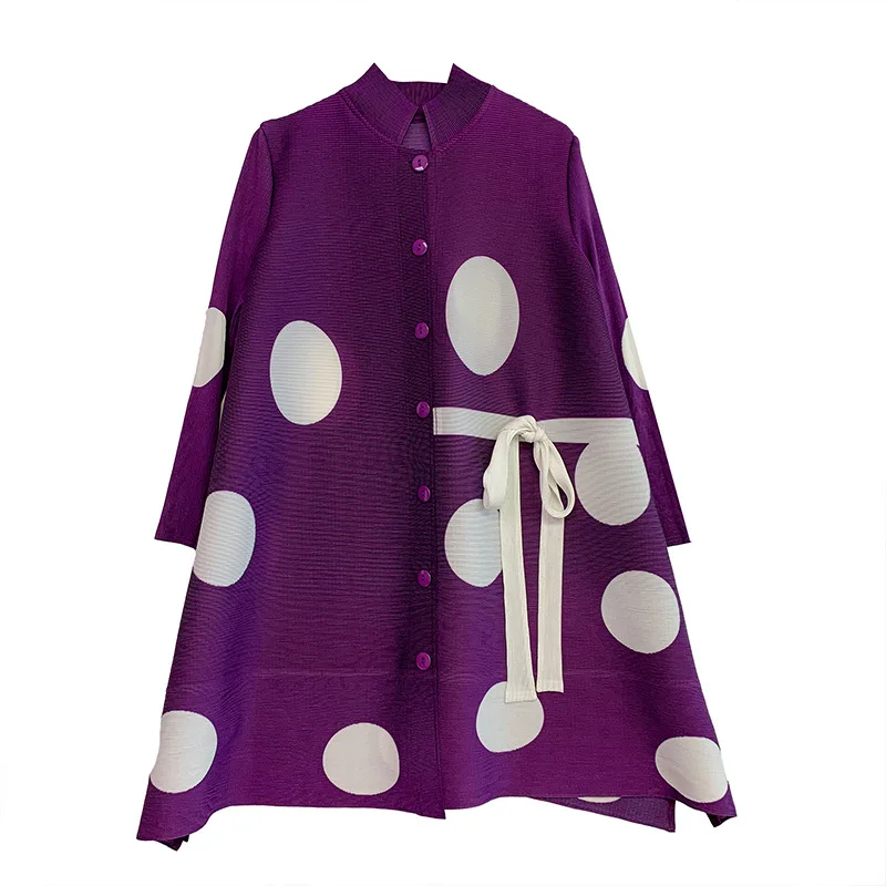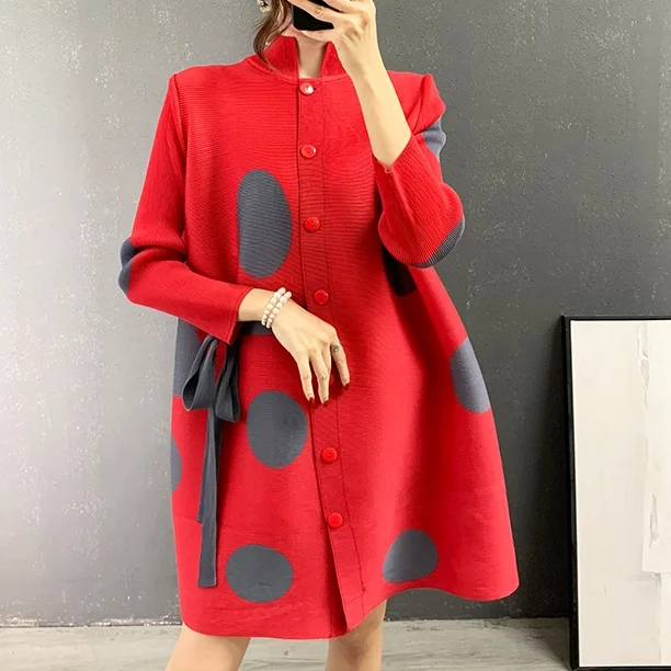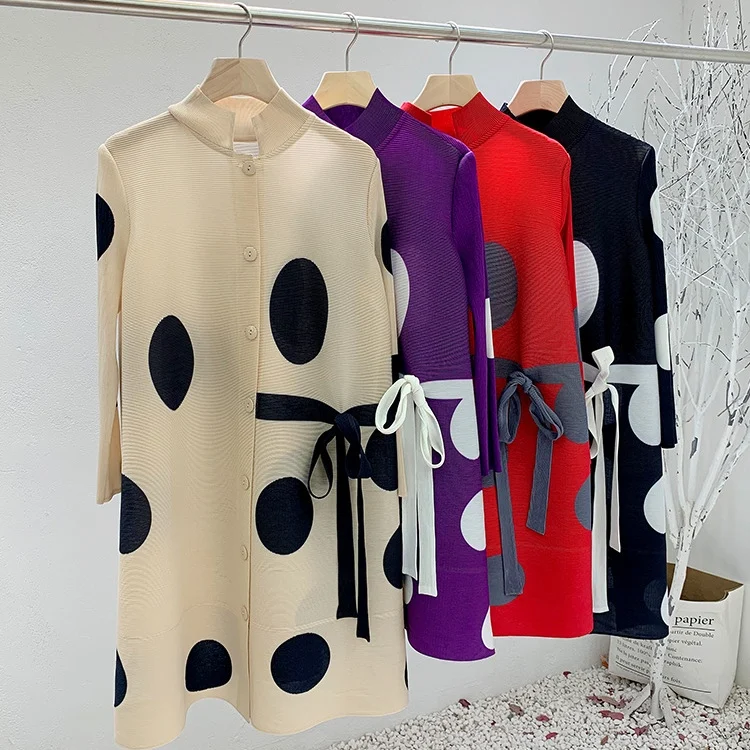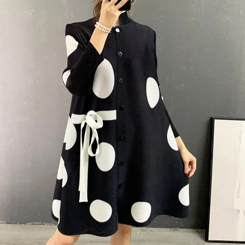 Product Name: New Pleated Polka Dot Tie Buckle Standing Collar Cardigan Loose Large Size Seven Sleeve Women’s Casual Dresses Sehe Fashion