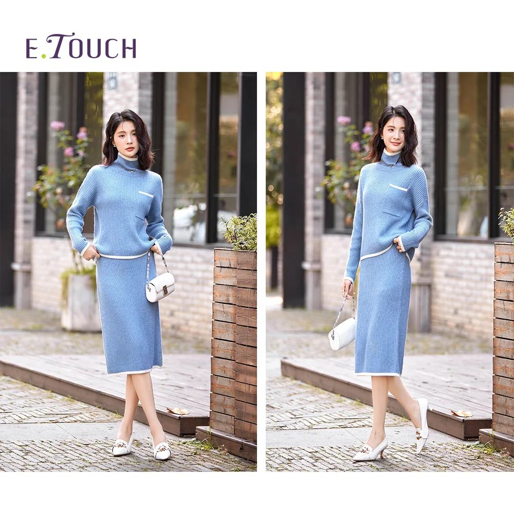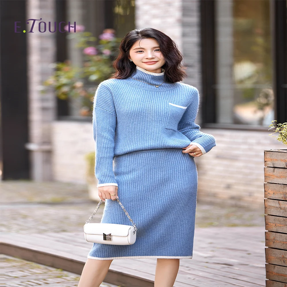 New Stylish High Quality Ladies Suit Blue Temperament Knit Pullover Long Sleeve Half Skirt Suit Knitwear Sweater Dress