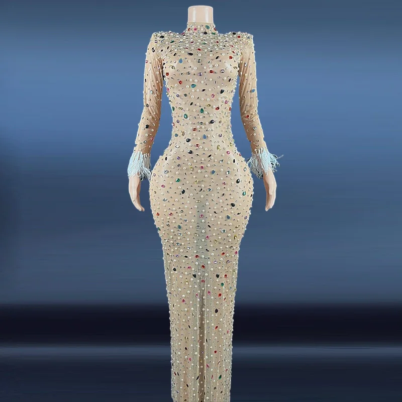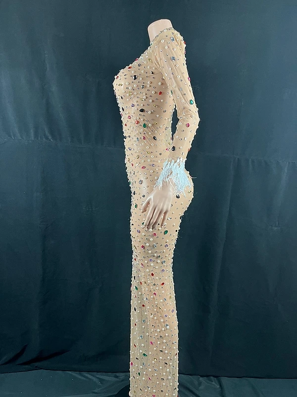 Product Name: New Woman Clothes 2022 Trending Multicolor Flashing Sexy Rhinestone Evening Gowns Feather Cuffs Long Mesh Tight Maxi Dress