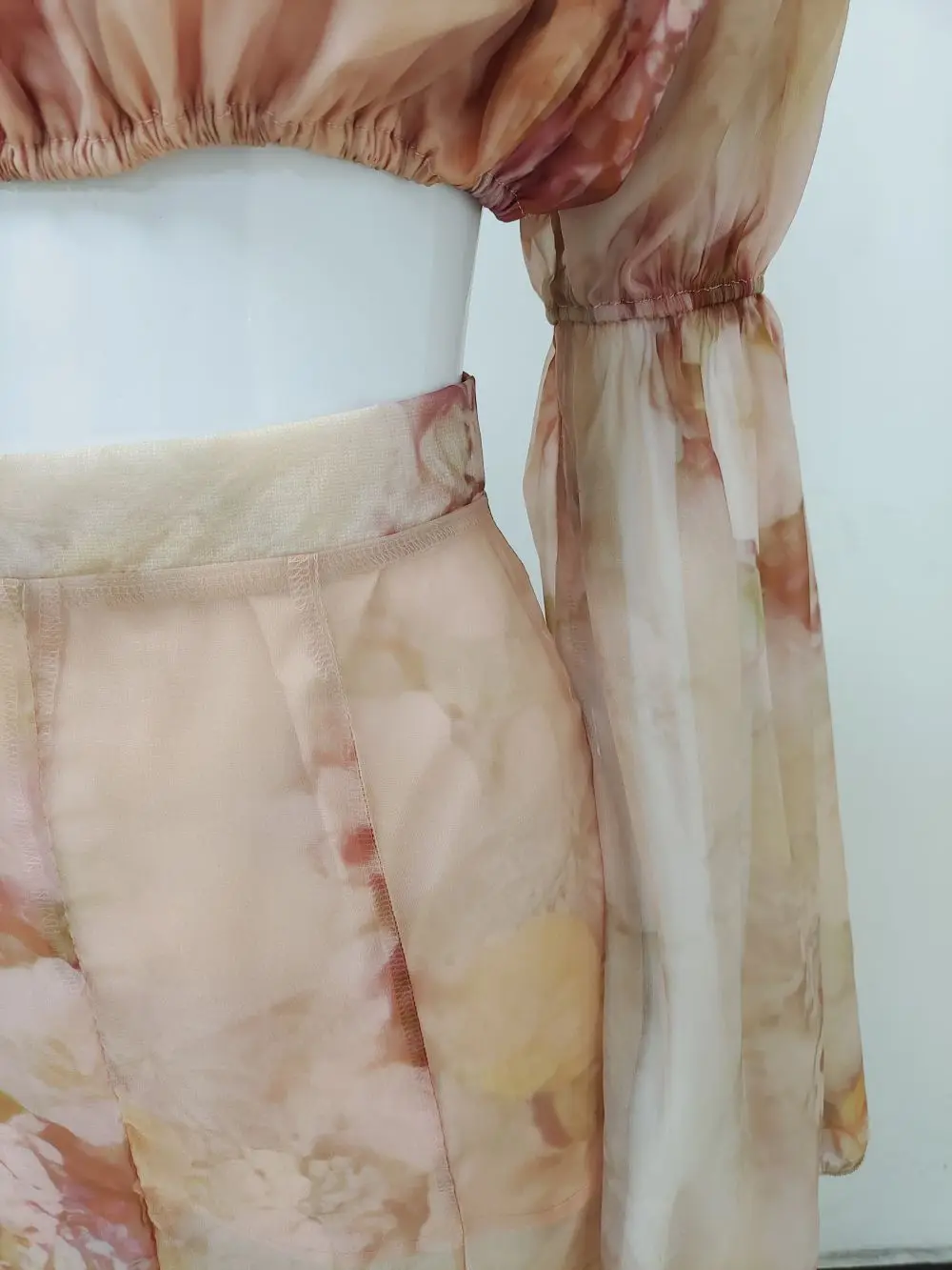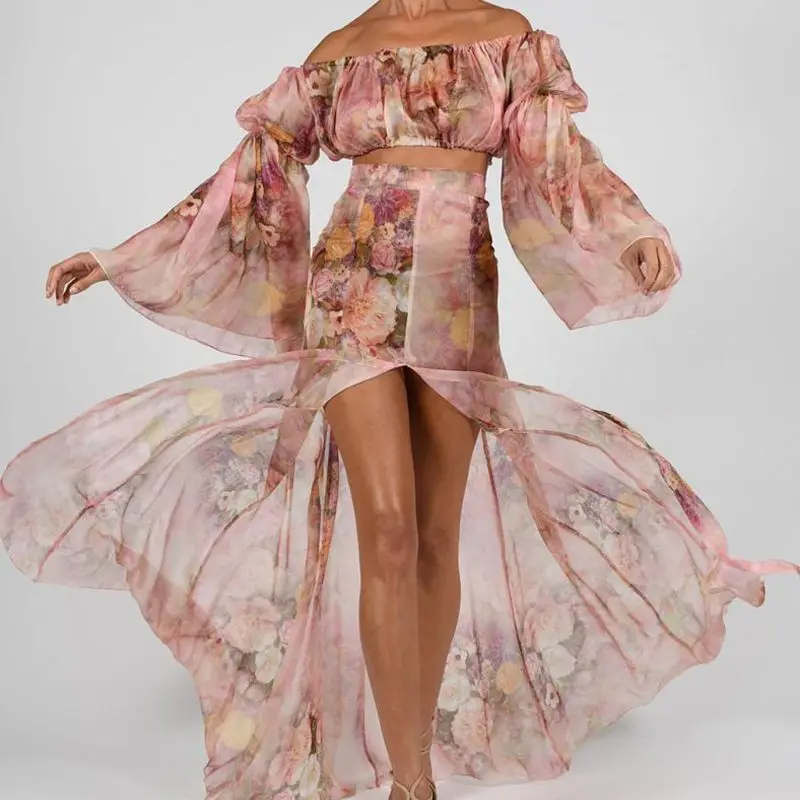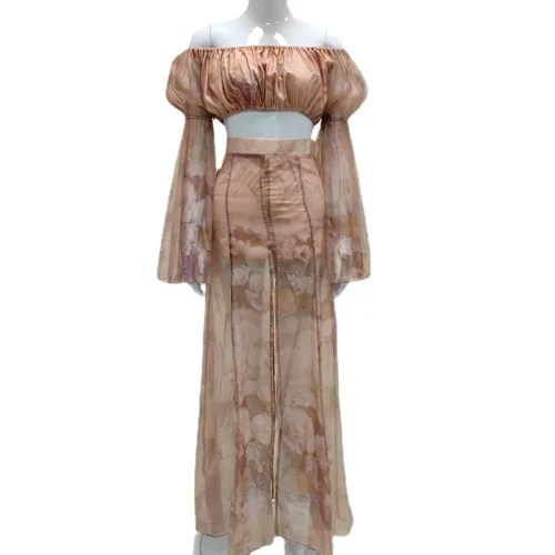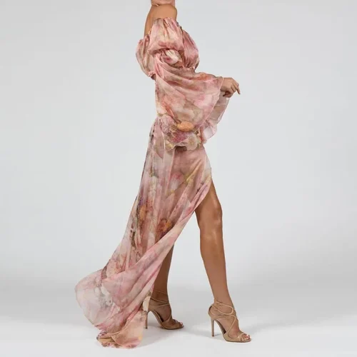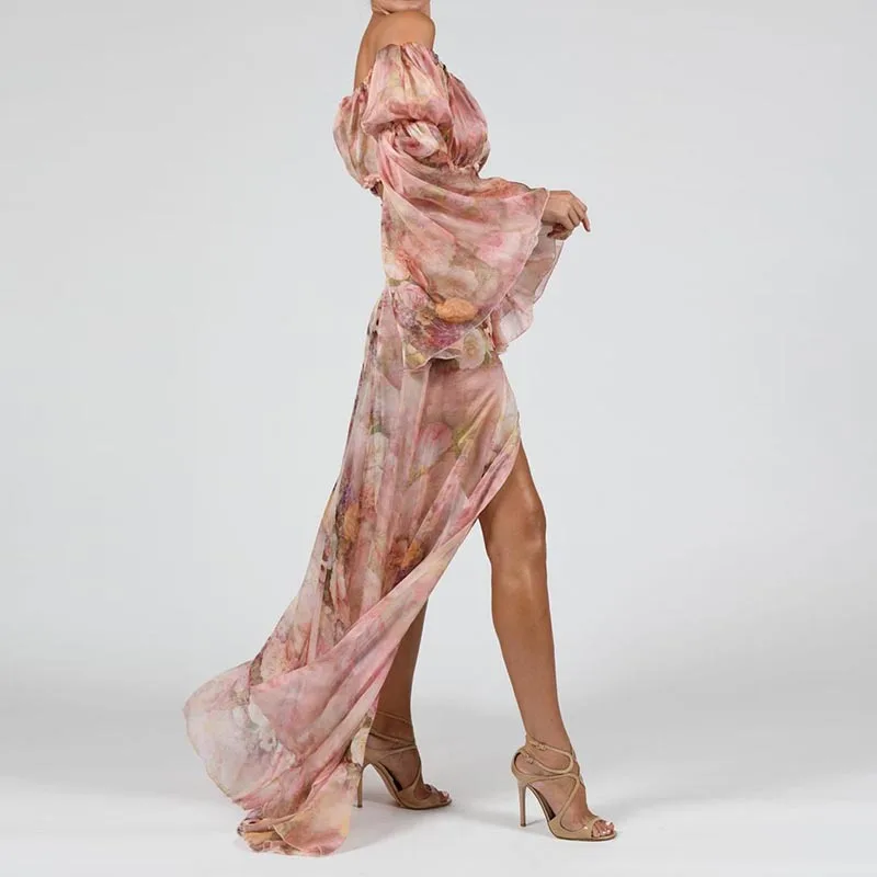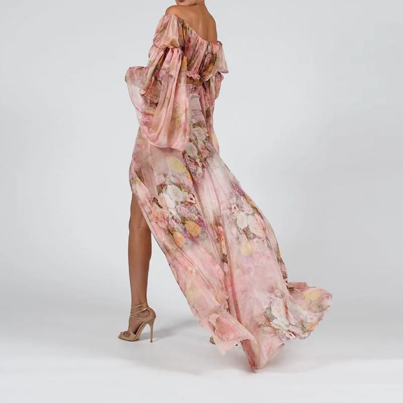 New Women’s Two-piece Vintage Floral Dress Sexy off the Shoulder Slit Long Dress for Ladies