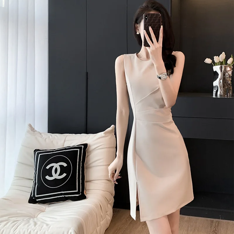 Product Name: Nice Ladies Dress Women Suit Fabric Sleeveless Slit Sundress Knee Length Black Skirt