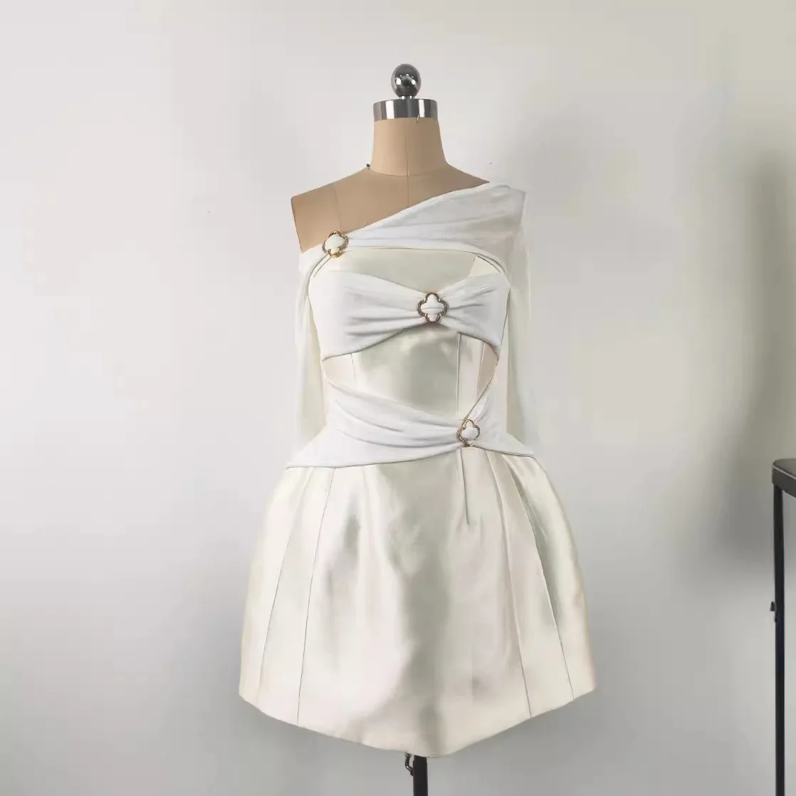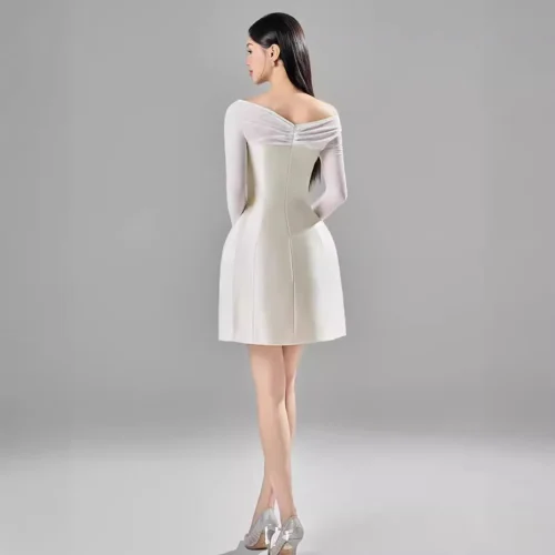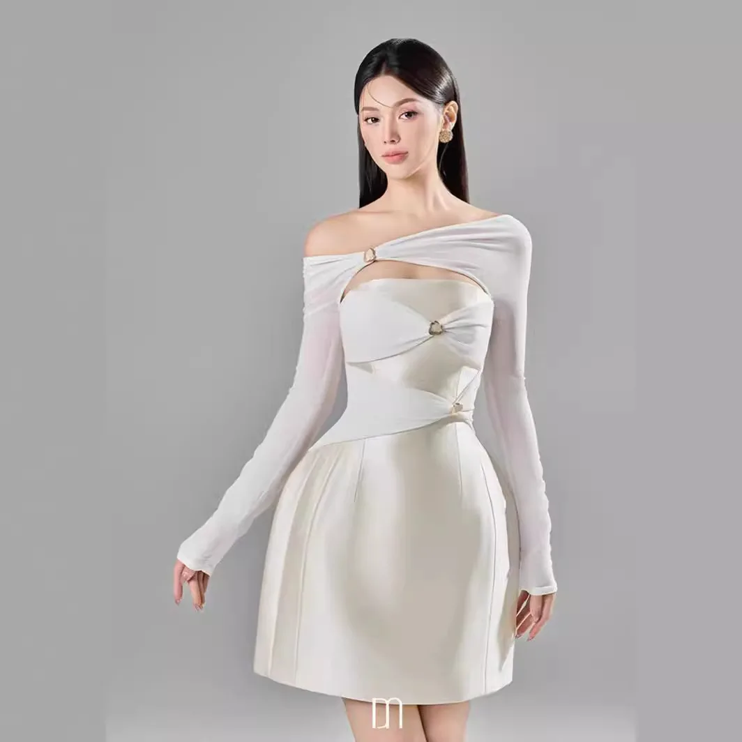 Product Name: Niche Elegant Satin Dress Off-Shoulder V-Neck Waist-Cinching Short Mini Length Casual Style for Office Spring Summer Solid Front
