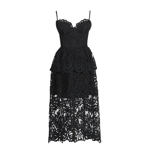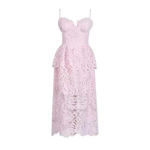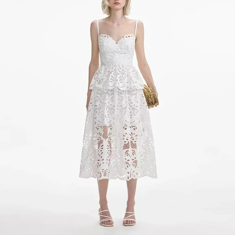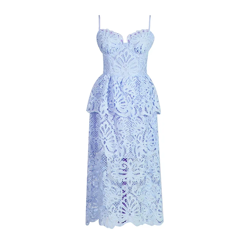 Novia Party Dress 2024 Summer Fashion Style Ladies Spaghetti Strap Allover Crochet Lace Embroidery Midi White Pink Blue Dress