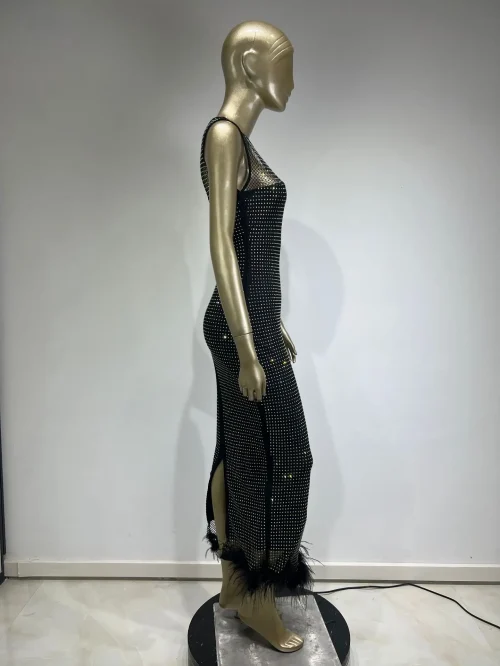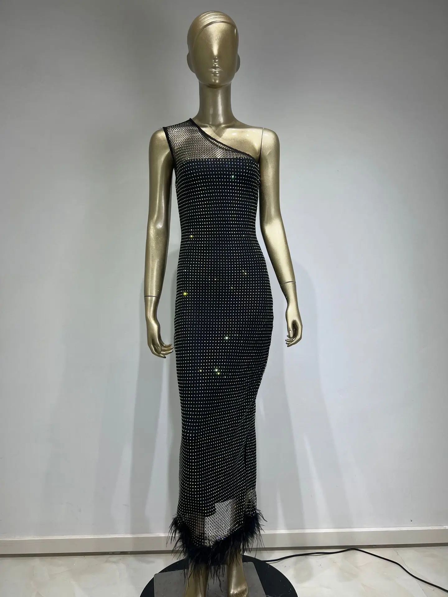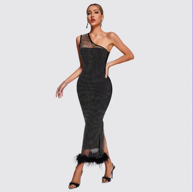 Product Name: Ocstrade Sparkly Sexy Black Primavera Ropa One Shoulder Feather Dress Sleeveless Cutout Bodycon Rhinestone Bandaged Dress