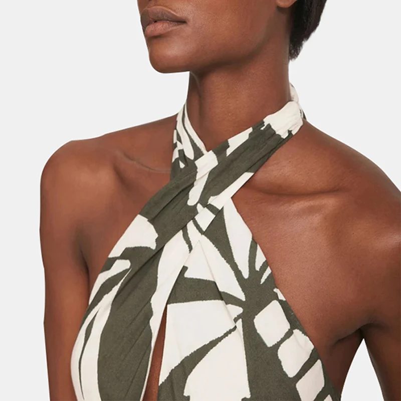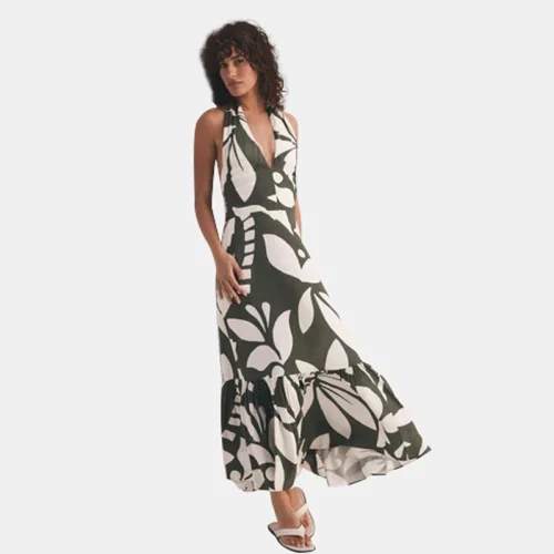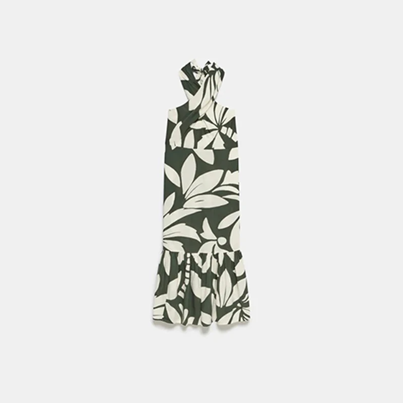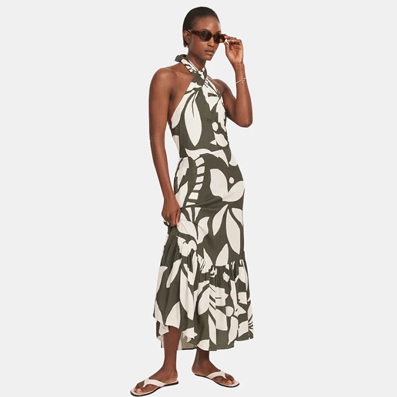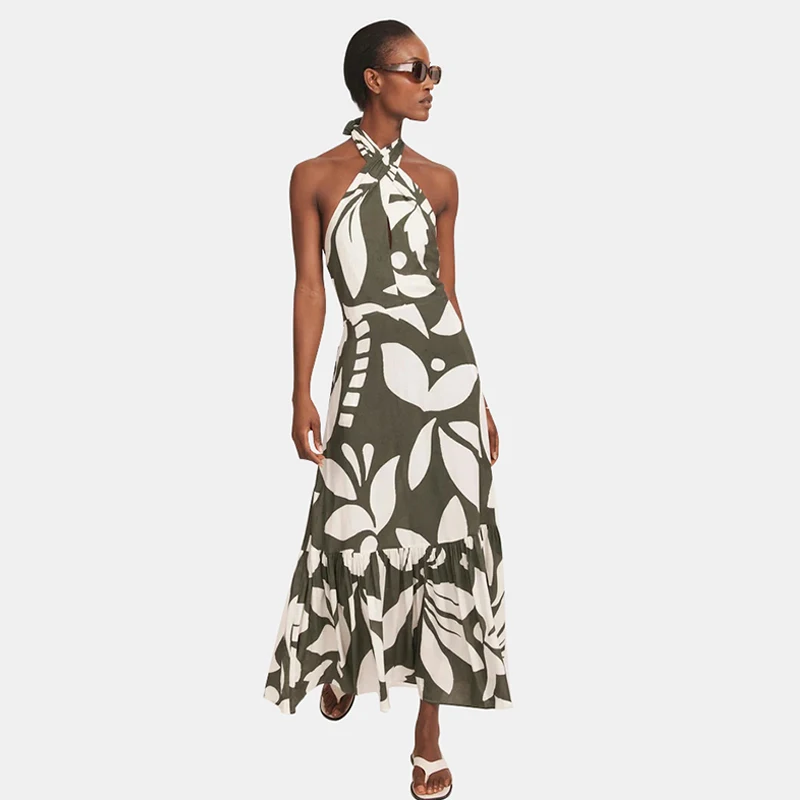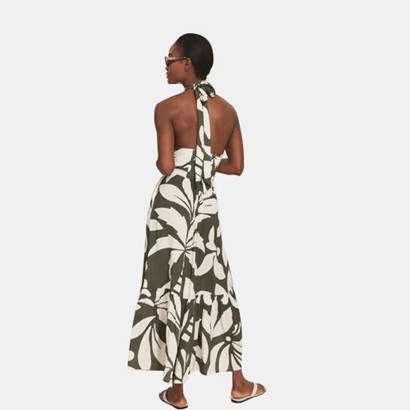 Product Name: Palm Print Halter Maxi Dress for Women with Knot Front Back Tie and Tiered Hem