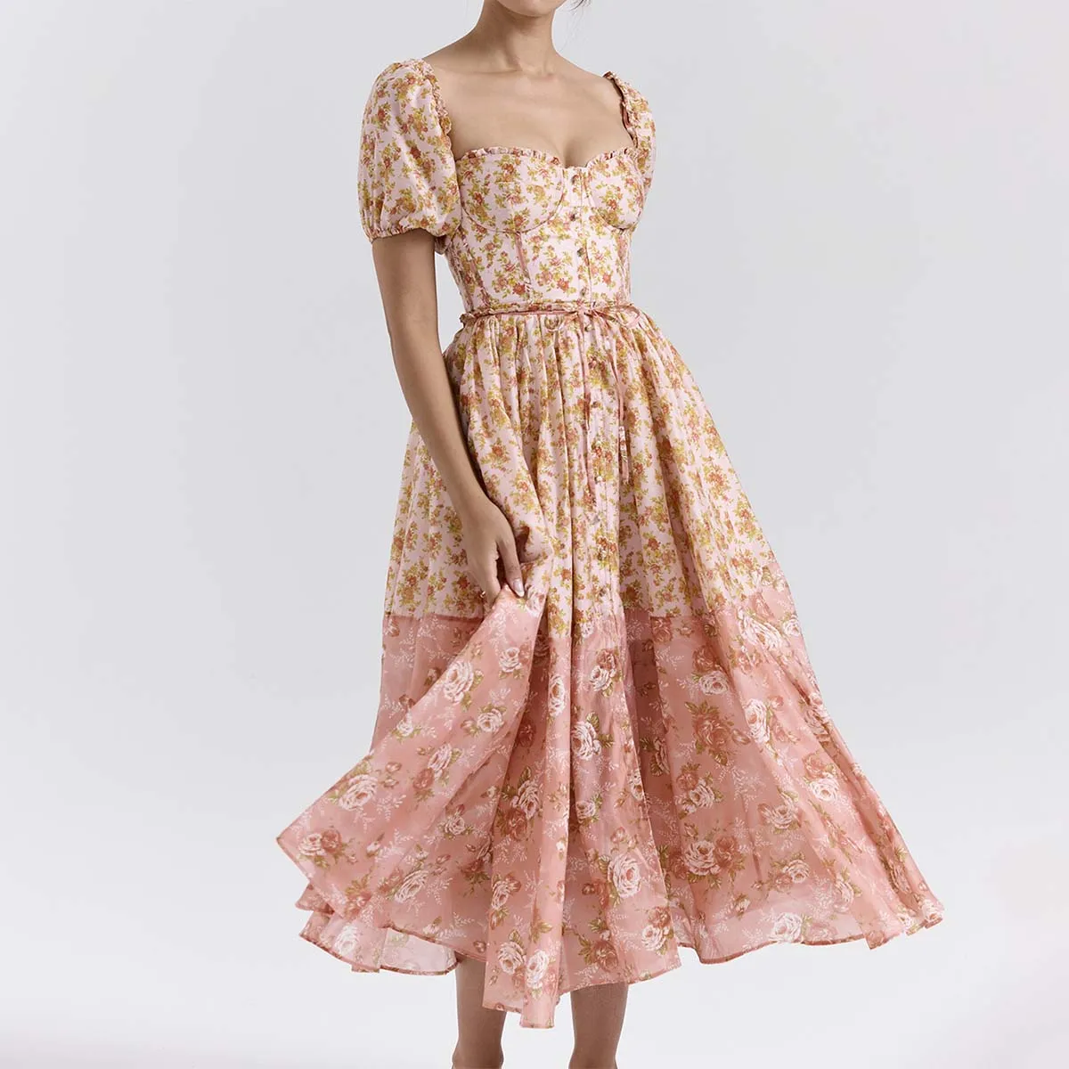 Peach Poppy Print Puff Sleeve Midi Sundress a Fresh and Playful Look Women Clothing