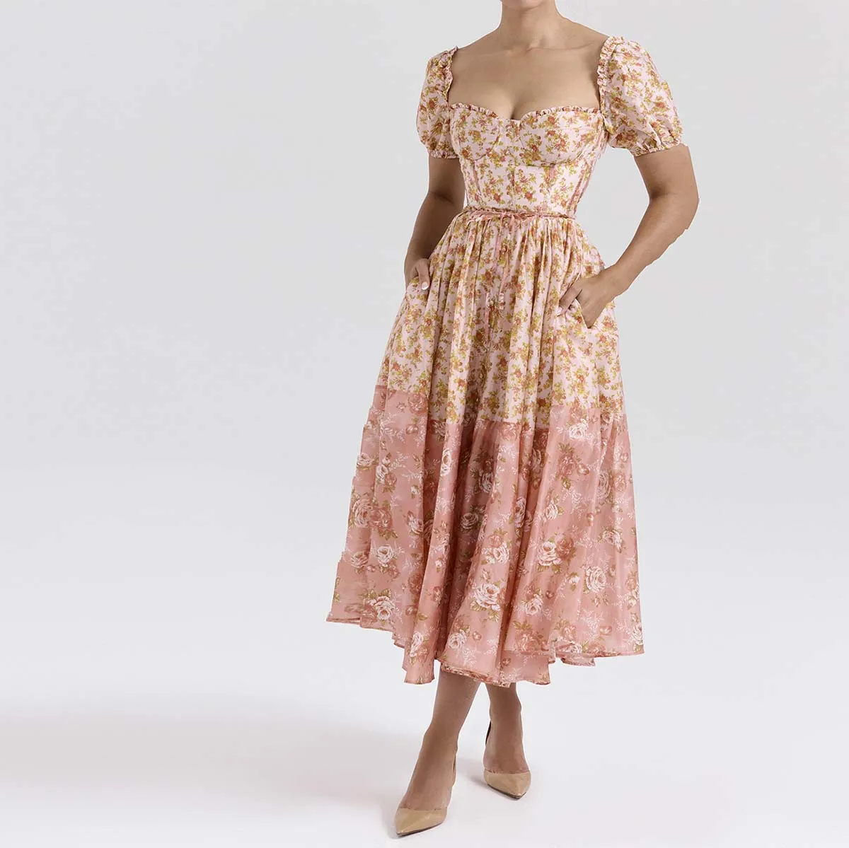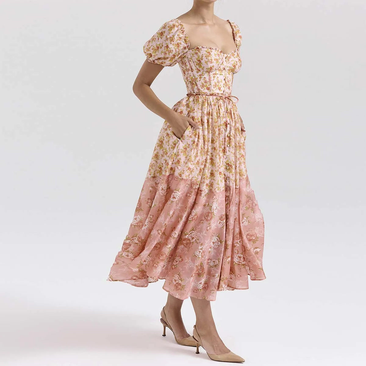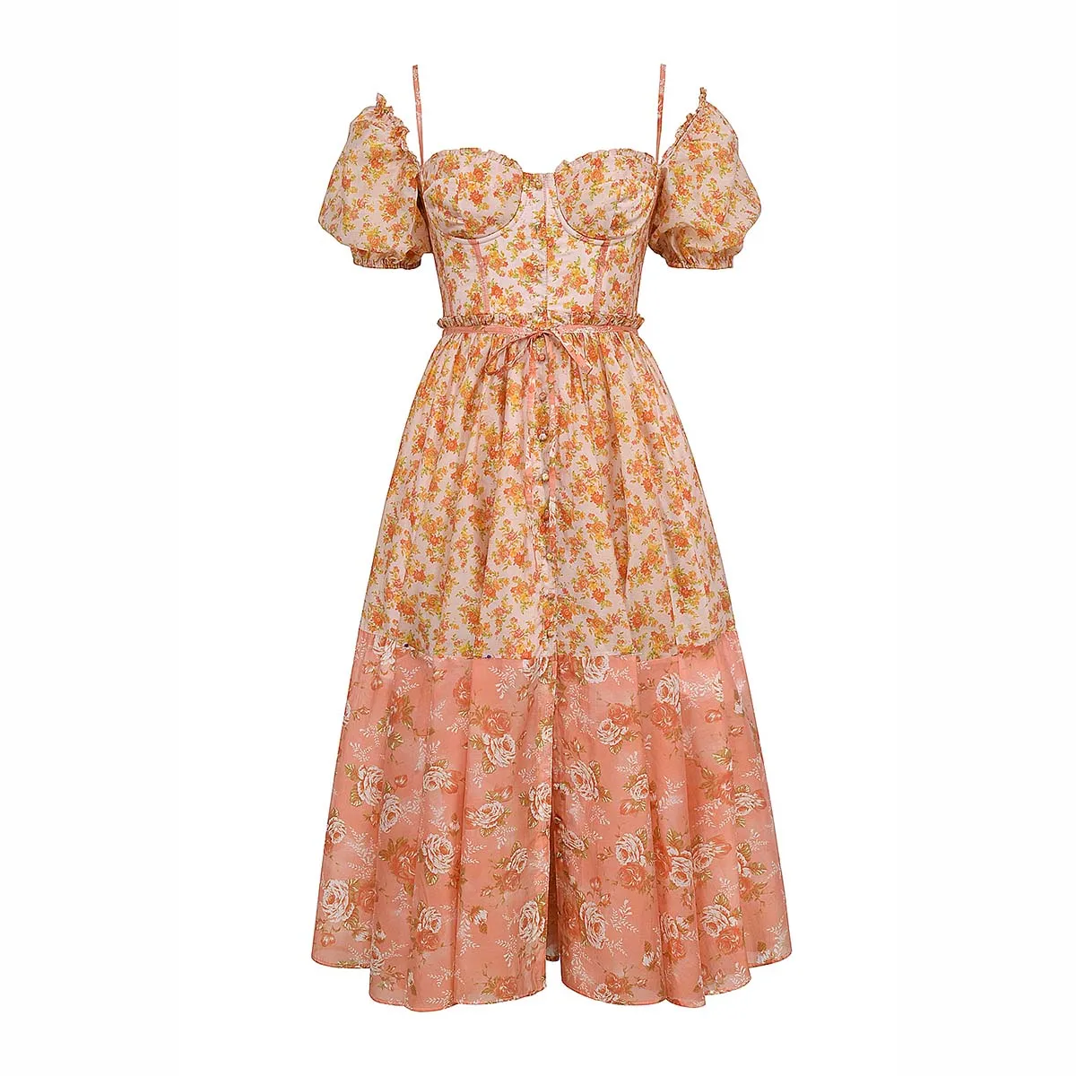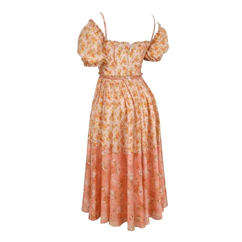 Product Name: Peach Poppy Print Puff Sleeve Midi Sundress a Fresh and Playful Look Women Clothing