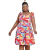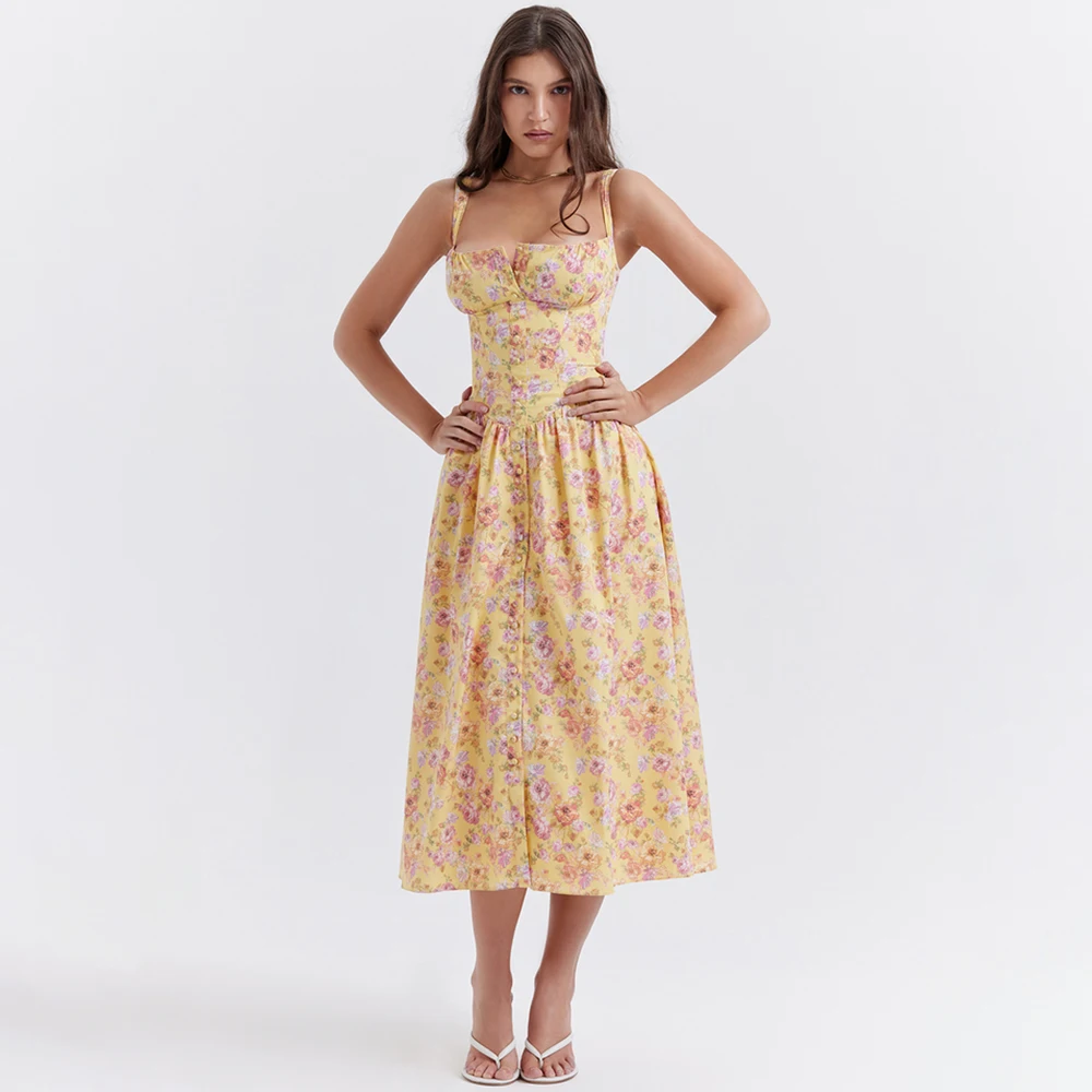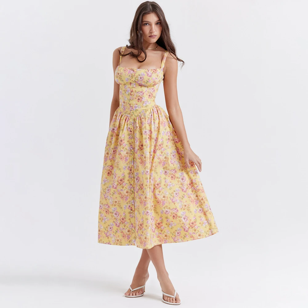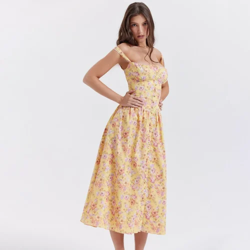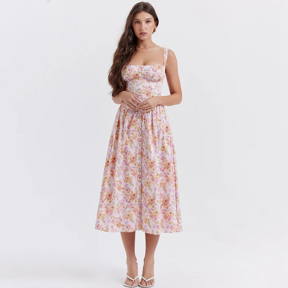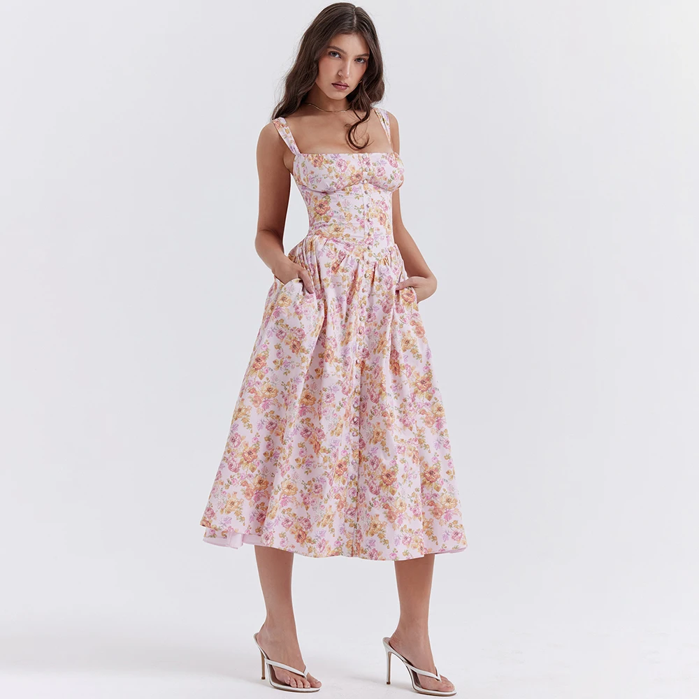 Pink Print Midi Sundress Lace Trim Ruffle Hem Sleeveless Dresses