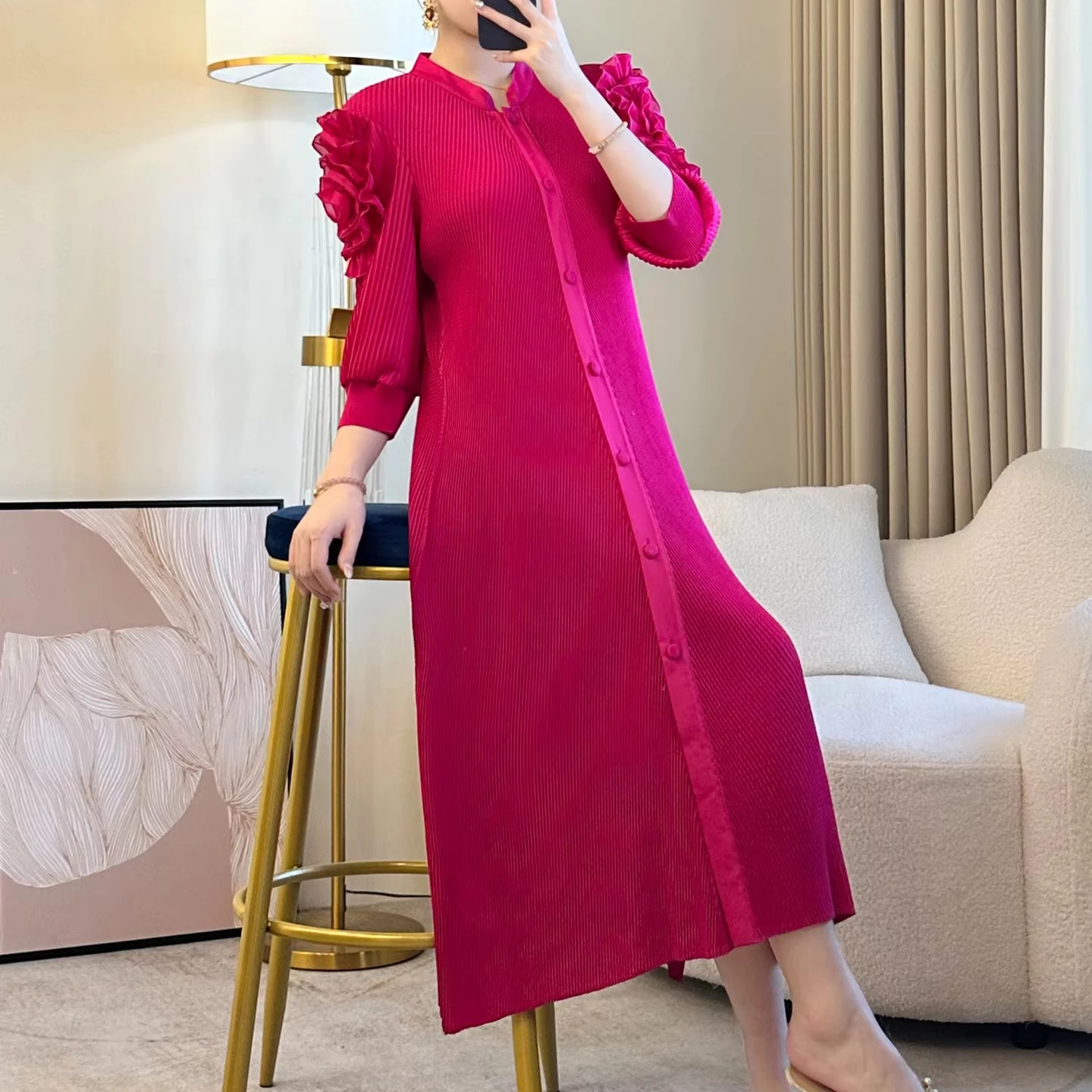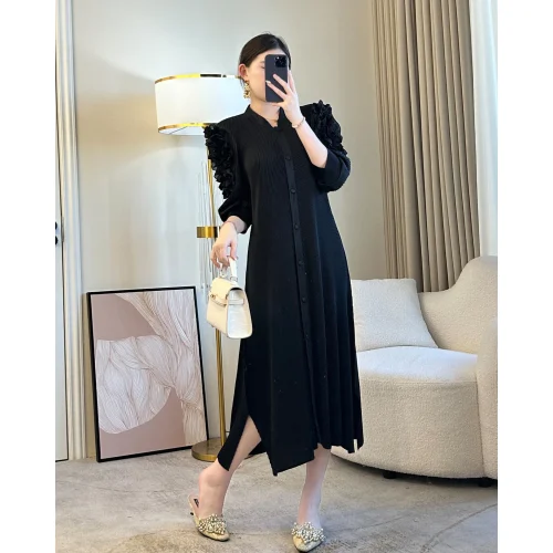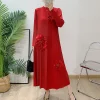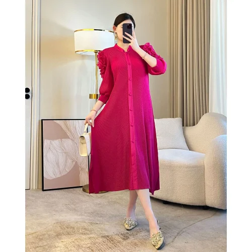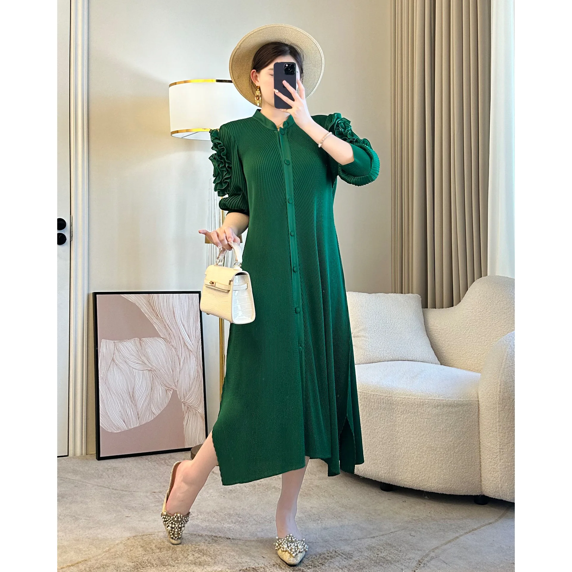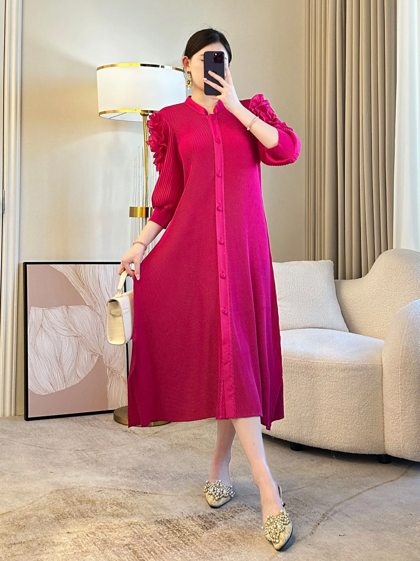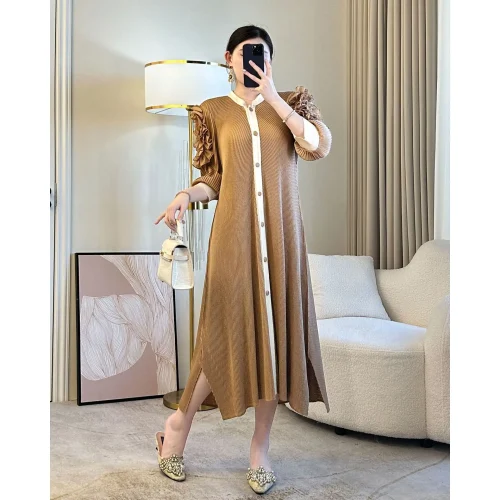 Pleated Mid-Length Dress for Women Fashionable and Loose Trumpet Sleeves Floral Design Pleated Dress