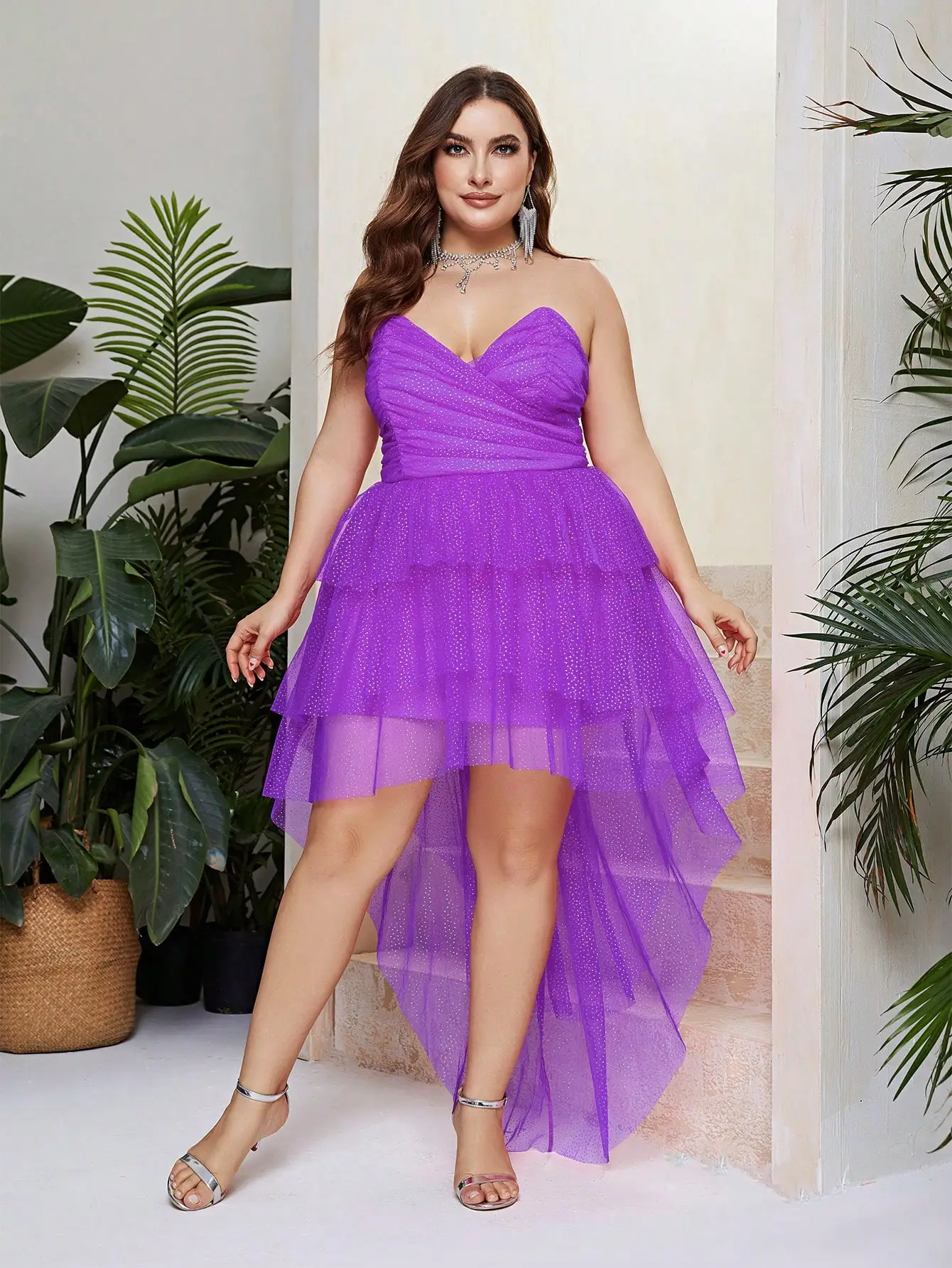 Product Name: Plus Ruched Bust Mesh Overlay High Low Hem Tube Dress Elegant Dresses Women Evening