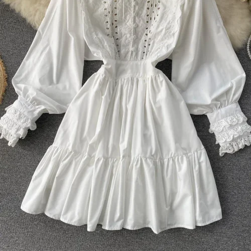 Q109013 Hepburn Short Lace Flower Lantern Sleeves Waist Slim Single-breasted Large-swing Ruffled Hollow Out Maxi Dress
