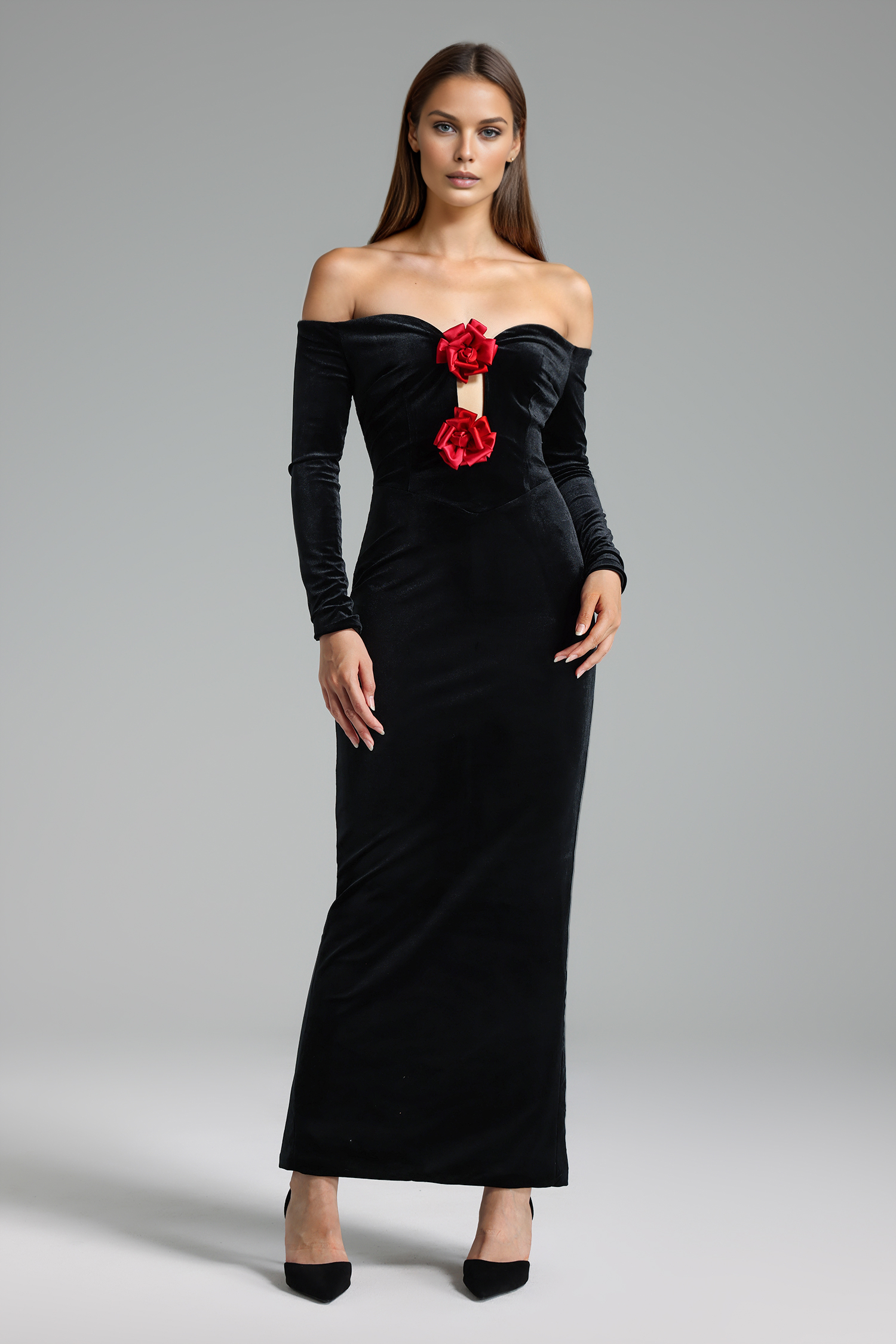 Riley Off Shoulders Long Sleeves Flowers Velvet Maxi Dress
