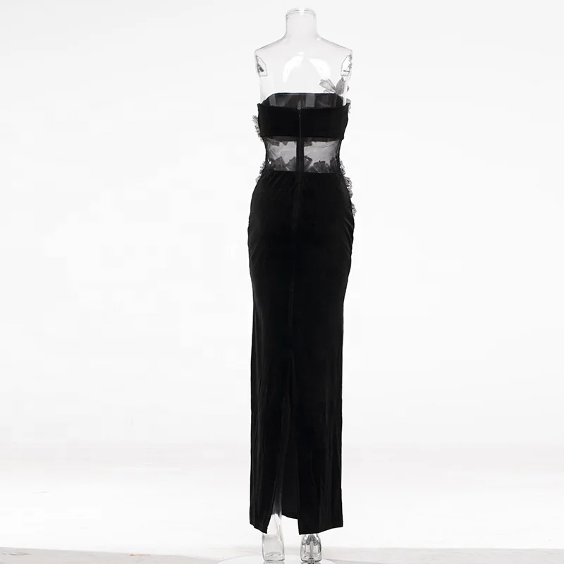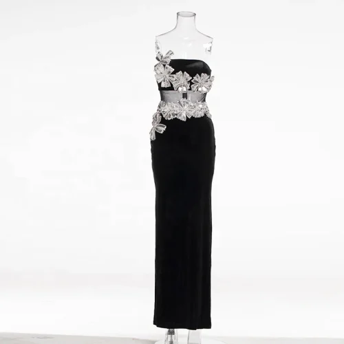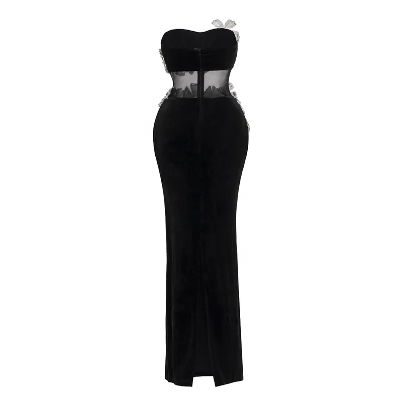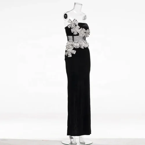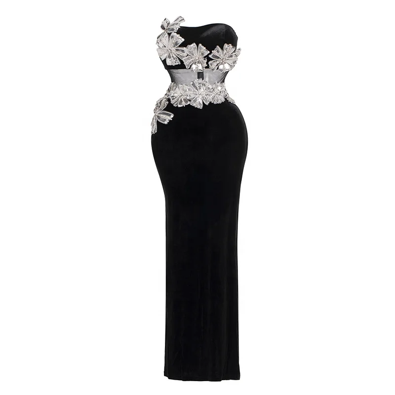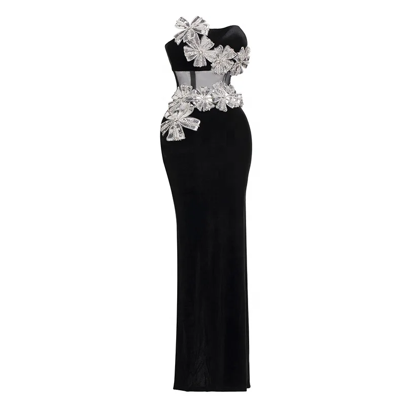 Strapless Sculpted Bodycon Floor Length Gown Rhinestone Sequin Embellished 3D Bow Mesh Waist Cutout Elegant Party Dress