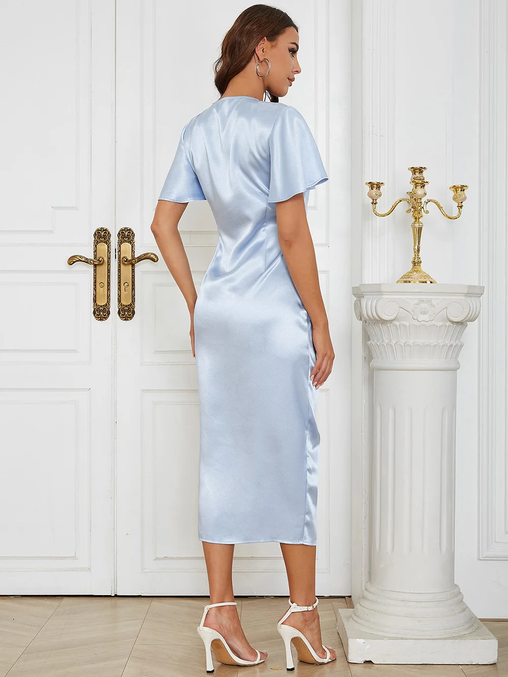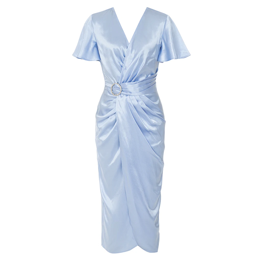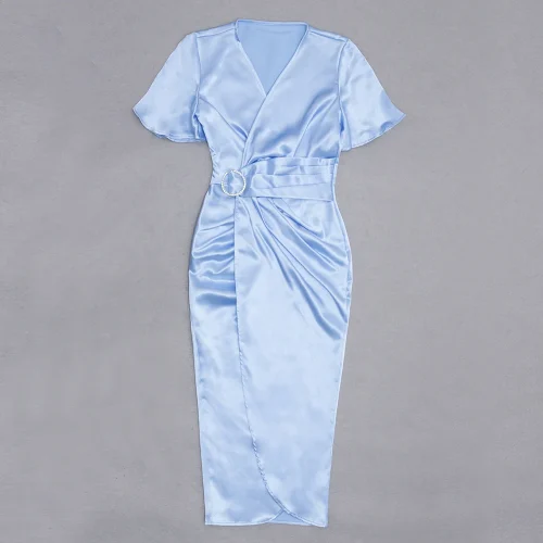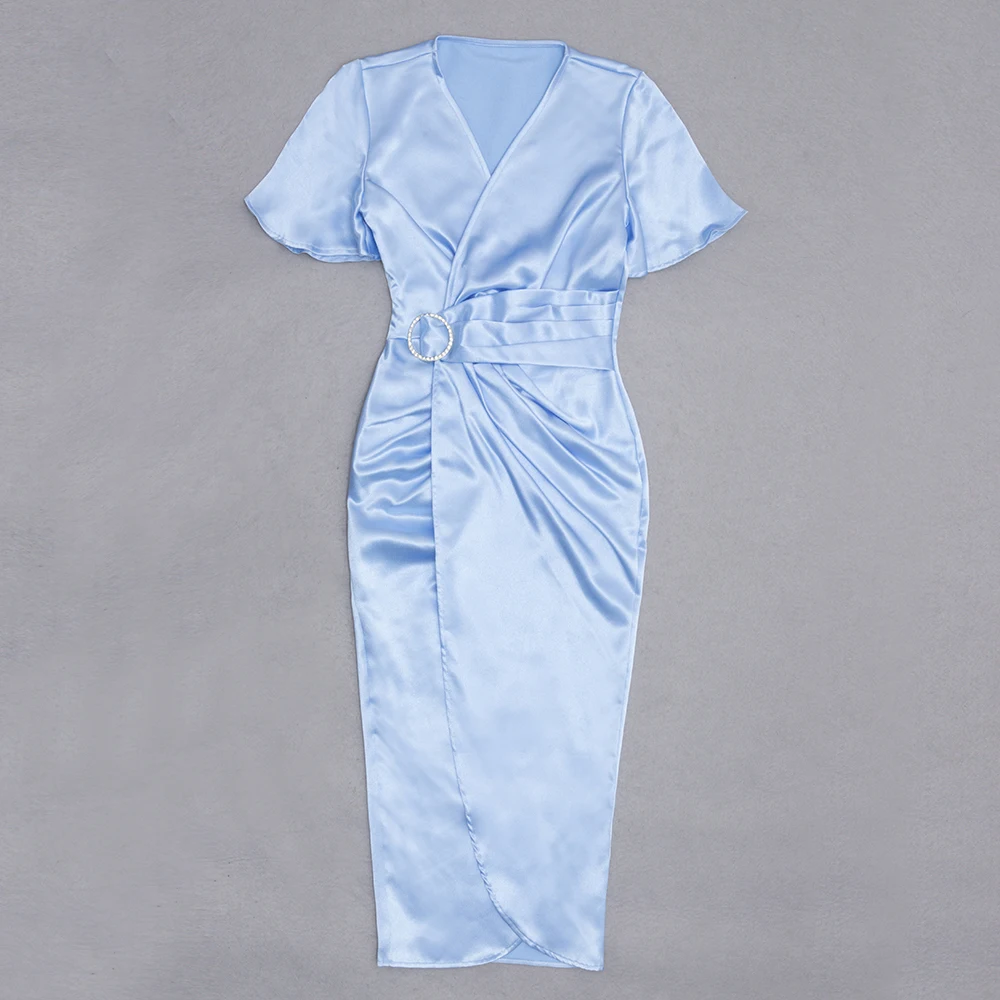 Product Name: Summer Sky Blue V-neck Elegant Dresses Women Short Sleeve Satin Casual Dress