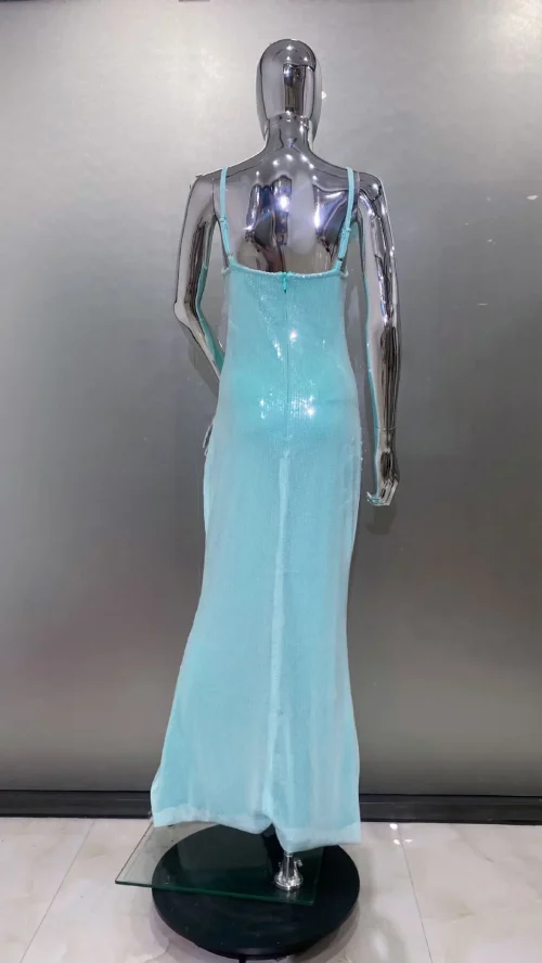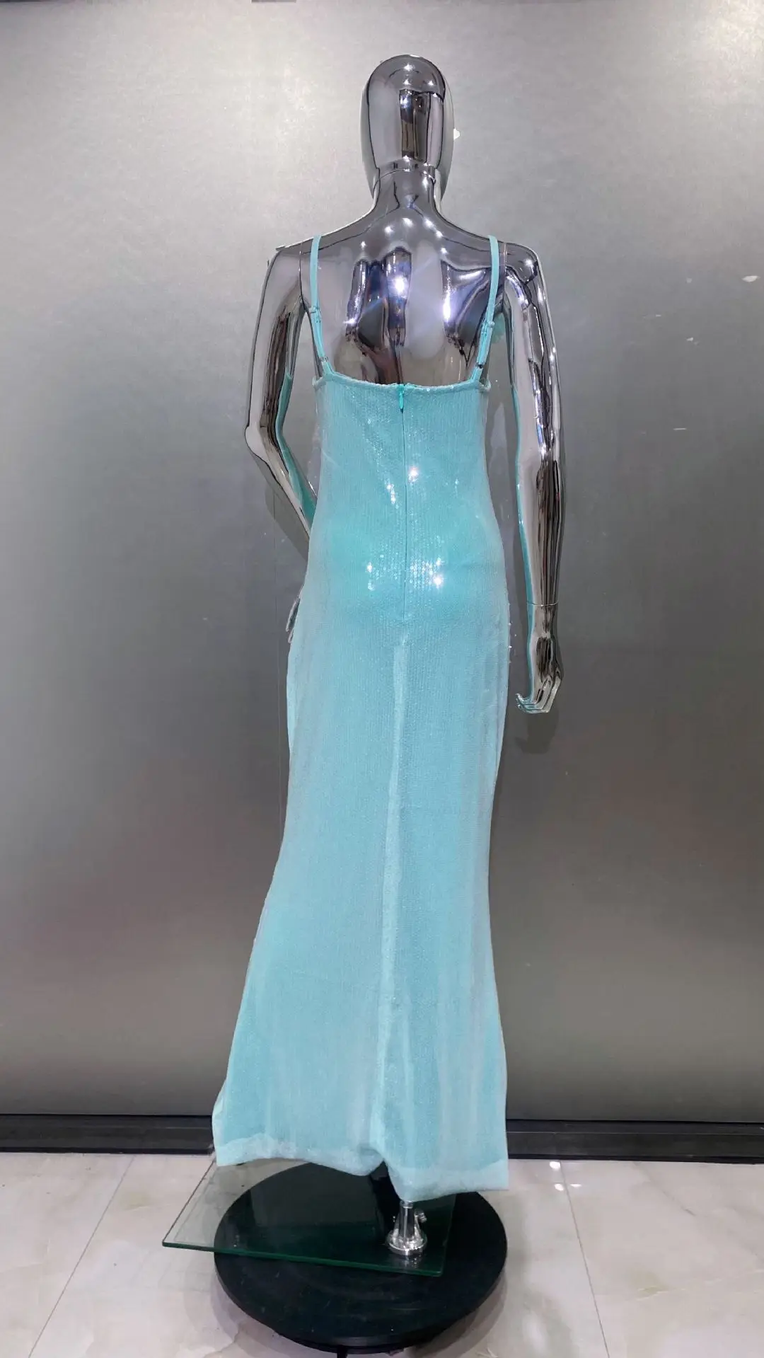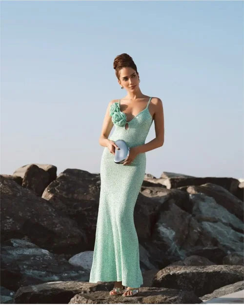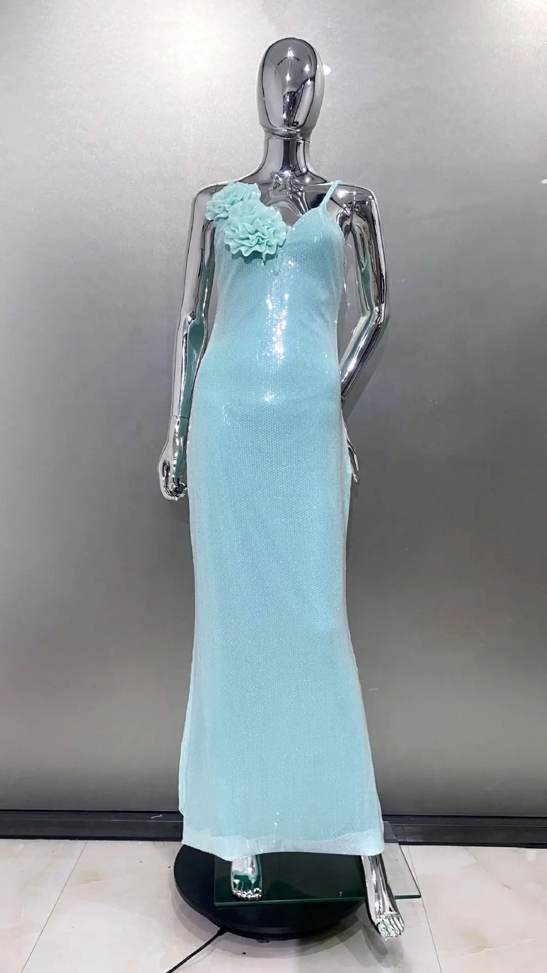 Summer Style Mint Green Sequin Suspender Long Dress With Three-dimensional Flower Hollow Out Vacation Dress