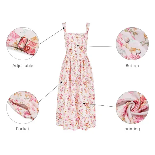 Sweet Summer Floral Print Casual Dresses Slim Waist Lace up Pockets Hidden Zippers Midi a Line Vacation Sundress
