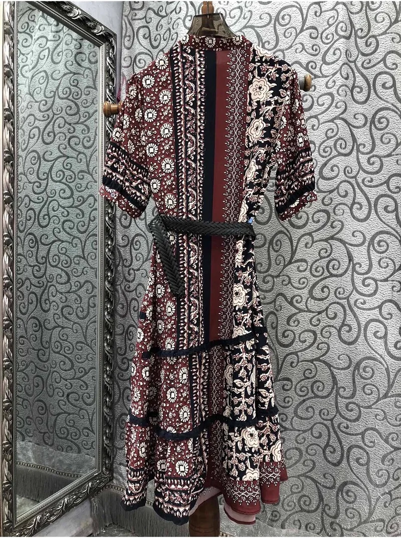 Top Quality New Summer Dress 2024 Fashion Designer Clothes Women Vintage Print Belt Deco Short Sleeve Mid-Calf Dress Luxury