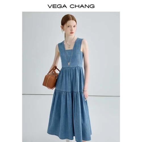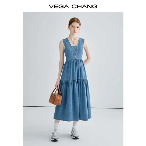 VEGA CHANG 2025 Summer Denim Halter Dress Women New French Retro Slimming Long Dress