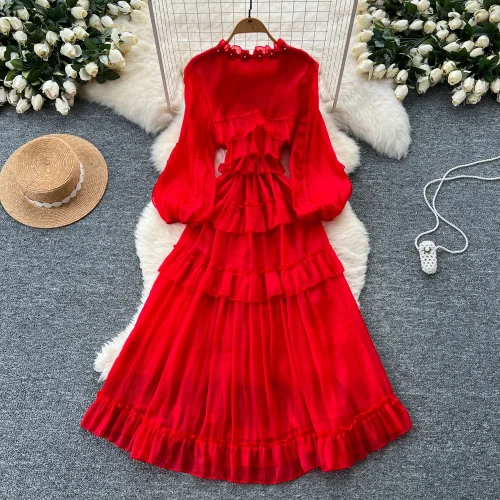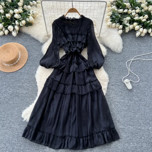 Product Name: Vintage Dress LW1437 Beaded Round Neck Puff Sleeve Tie-Waist Dress Women’S Ruffle Hem A-Line Elegant Dresses for Women