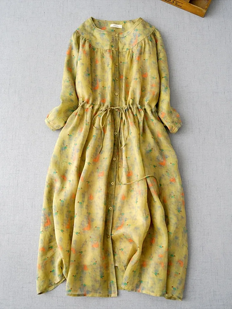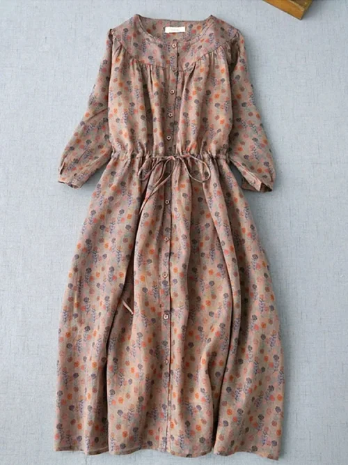 Product Name: Vintage O-Neck Half Sleeve Women Shirt Dresses 2024 New Lace Up Patchwork Single-Breasted Midi Dress Floral Sundress