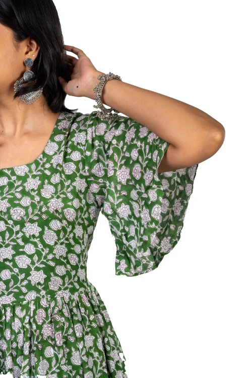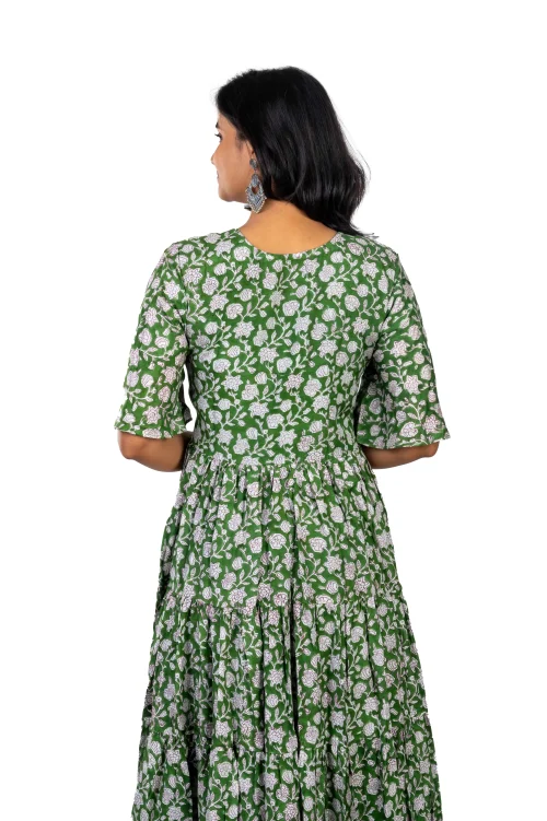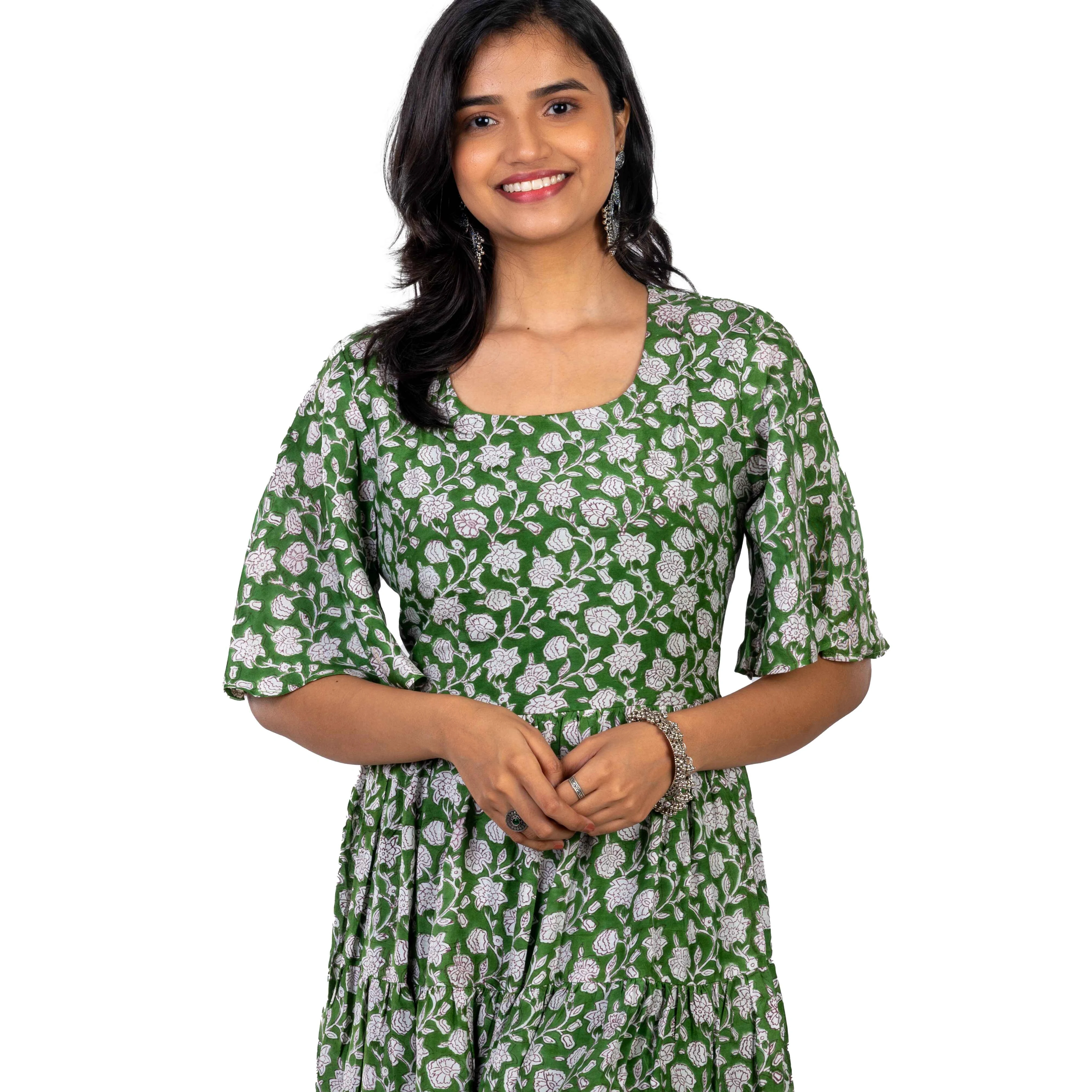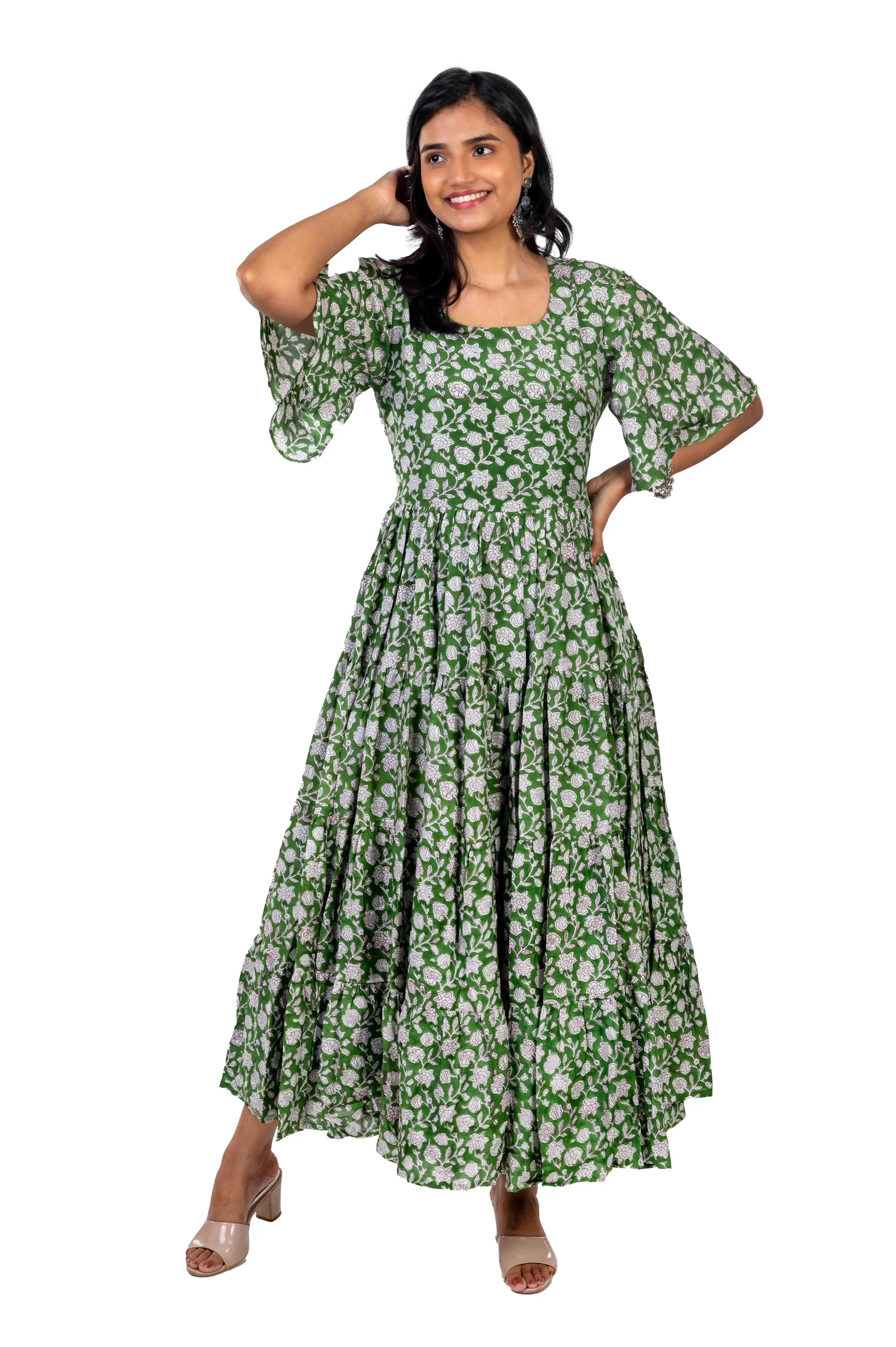 Product Name: Women Green Muslin Floral Printed Flared Maxi Kurti with Bell Sleeves Elegant Long One Piece With Lining for Ladies