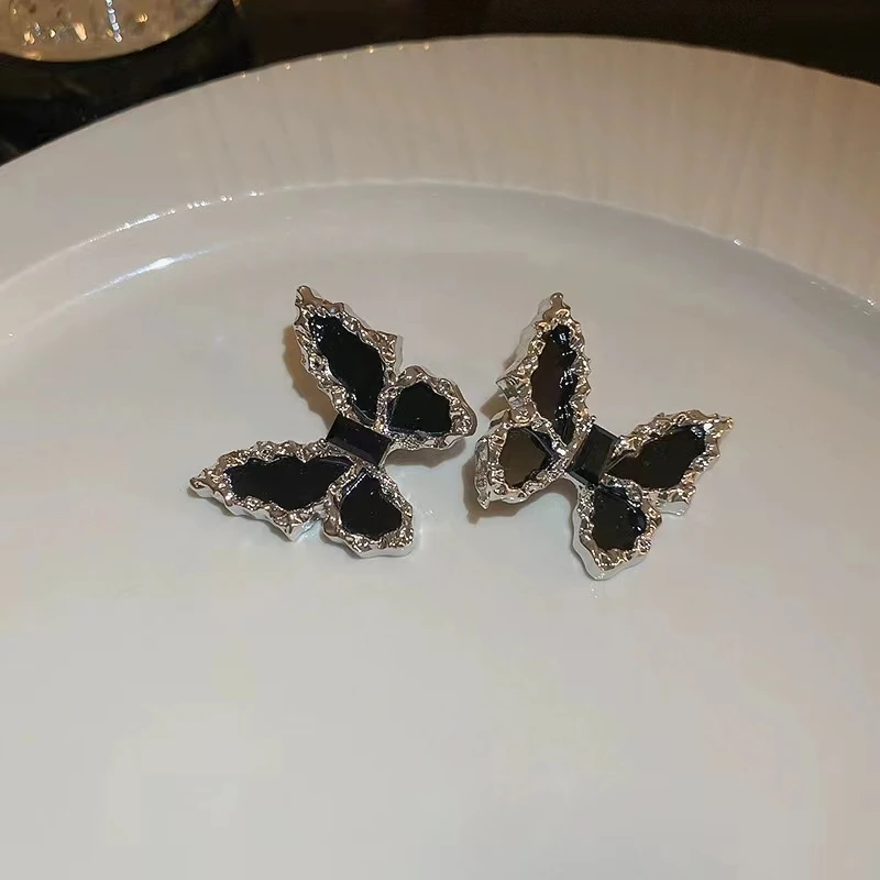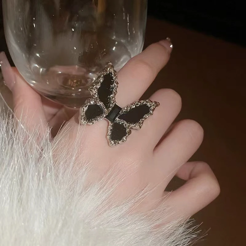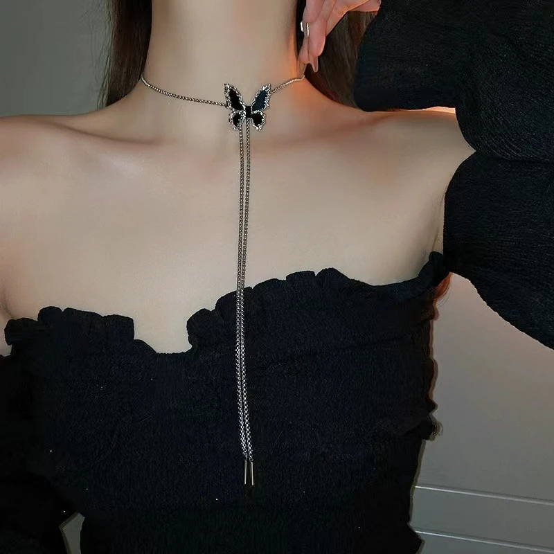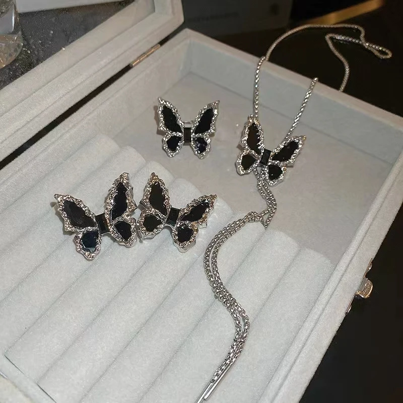 Product Name: Women Party Jewelry Sets Chain Tassel Necklace Rhinestone Earrings Ring Black Butterfly Necklace Set Jewelry