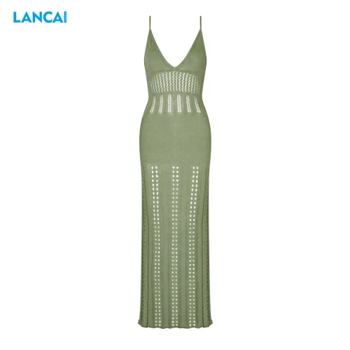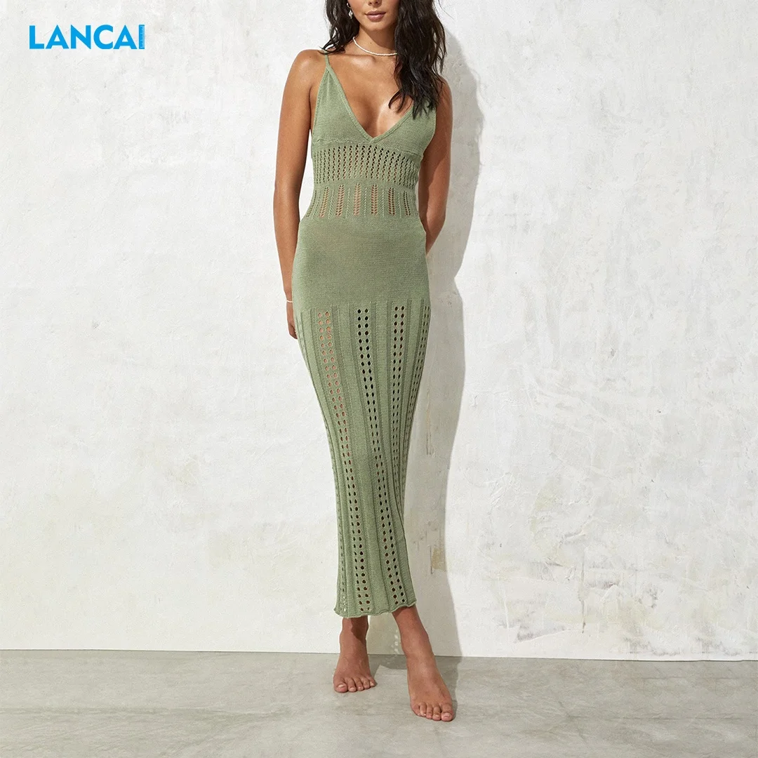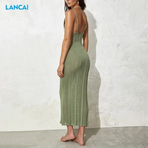 Women Summer Long Sun Dresses Elegant Bodycon Sundress Backless Beach Hollow Out Mesh Maxi Crochet Dress
