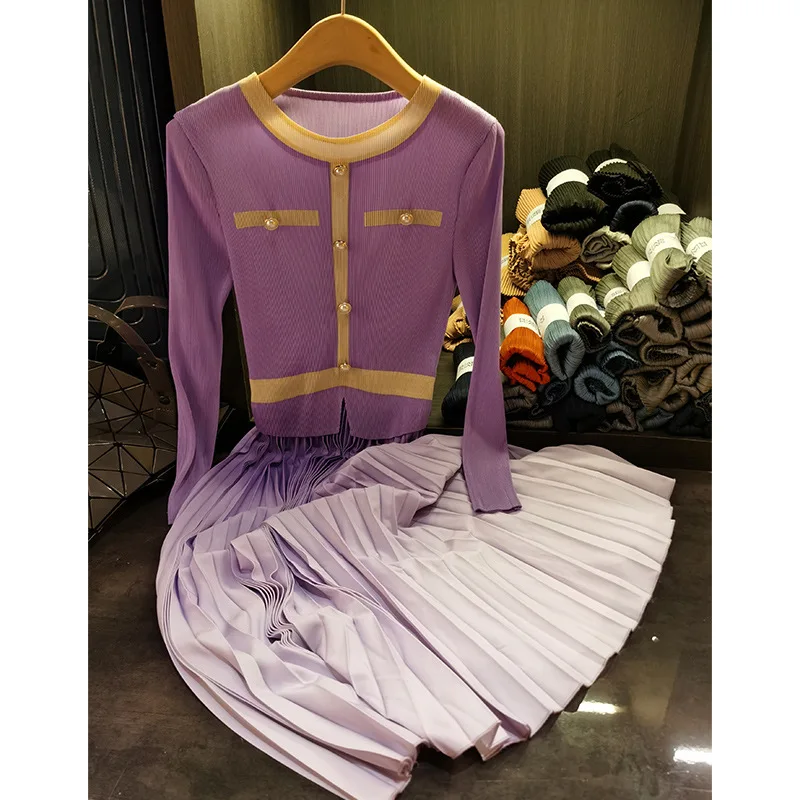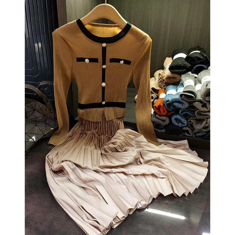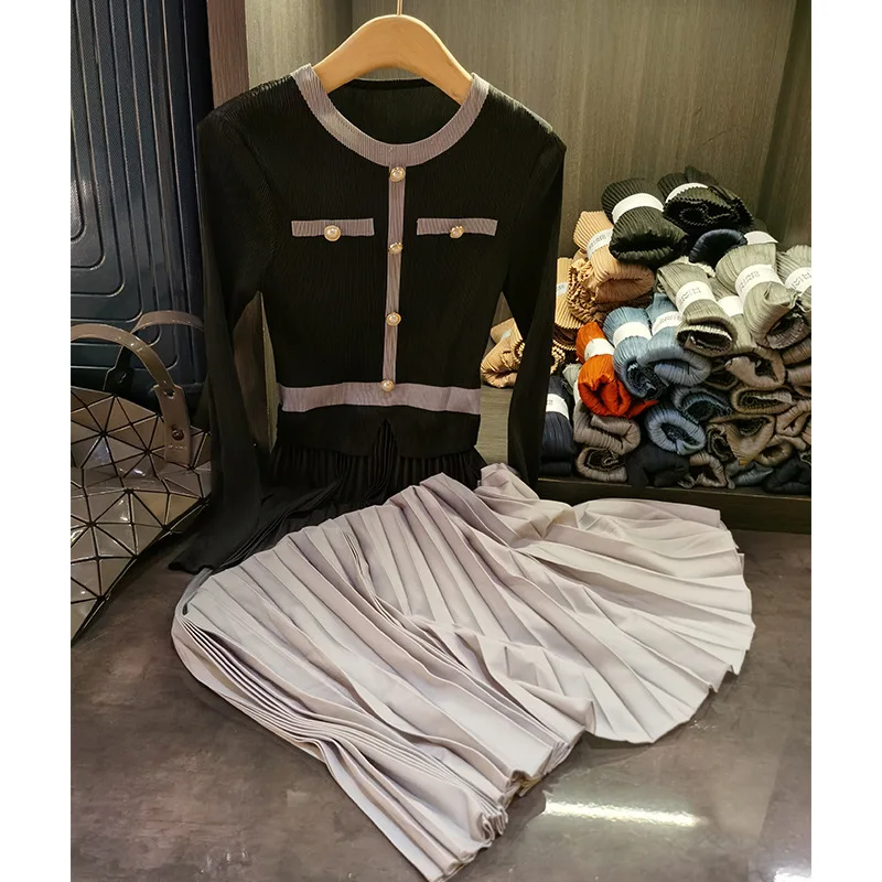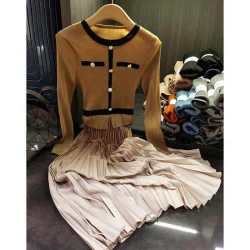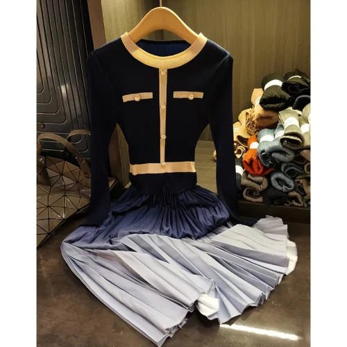 Product Name: Women’s 2025 Spring Classic round Neck Pleated Skirt Dress High-End Long Sleeved Casual Style with Natural Waistline