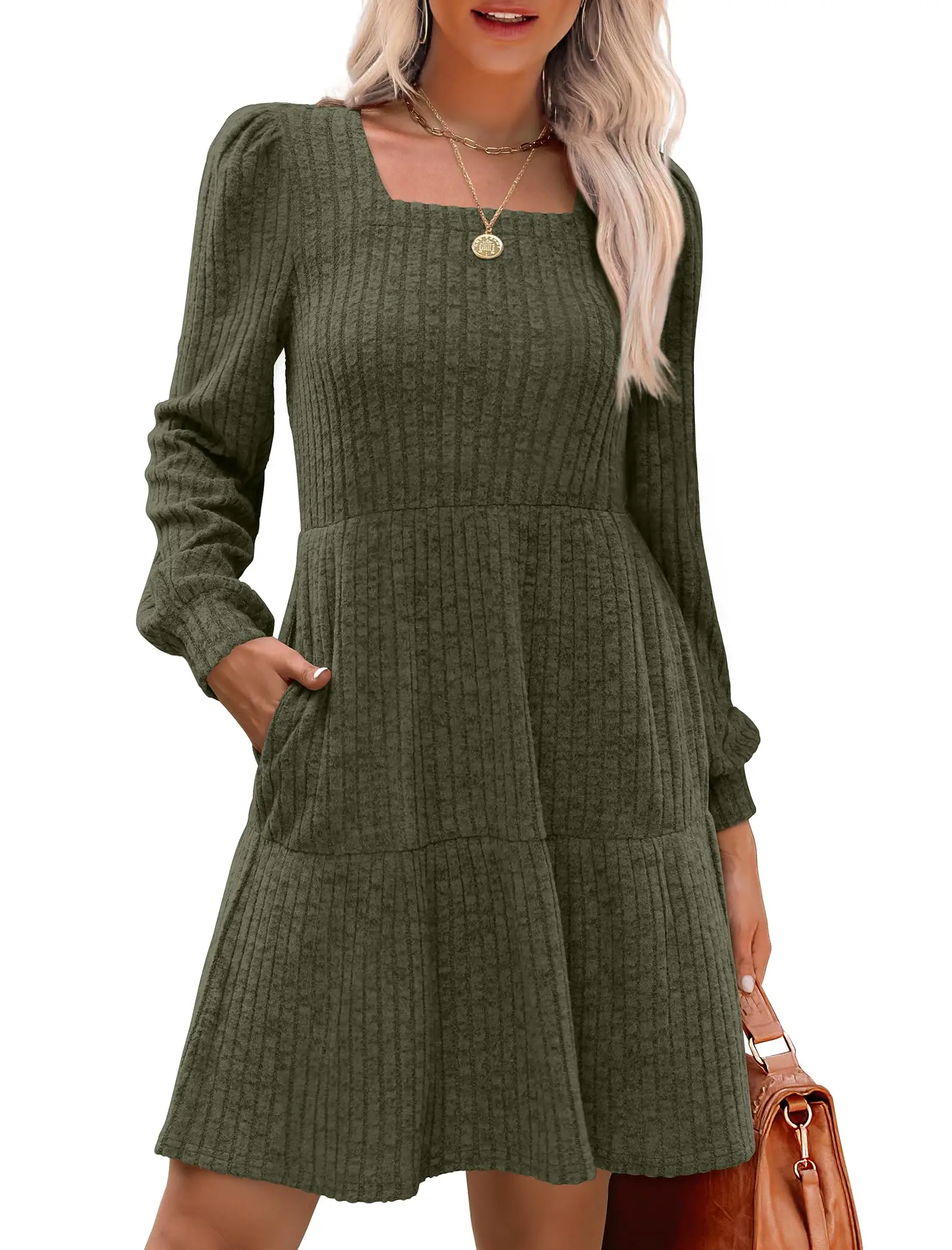 Women’s Casual Babydoll Sweater Dress with Square Neck & Long Sleeves Solid Pattern Washable Fall Dresses