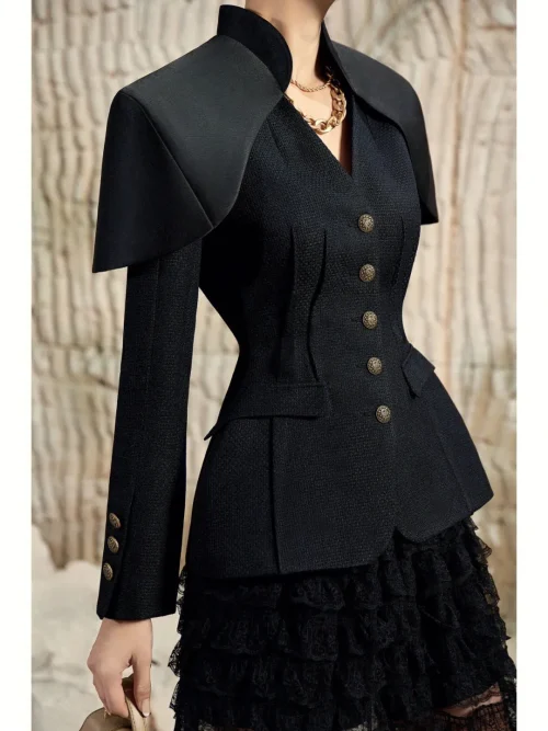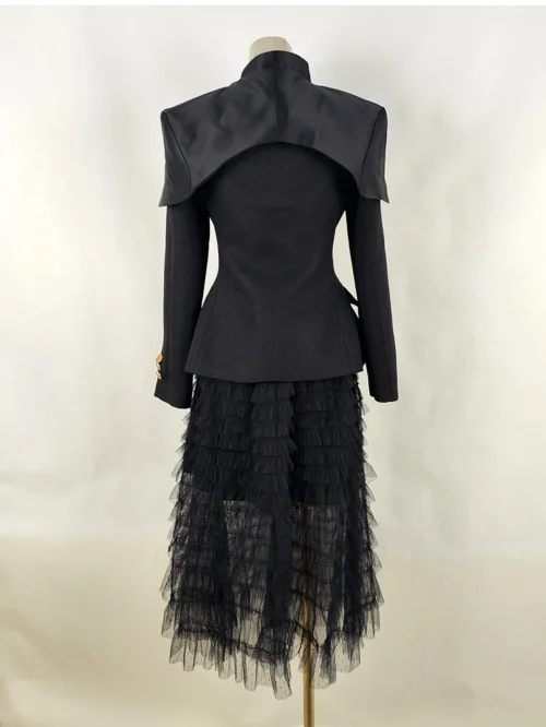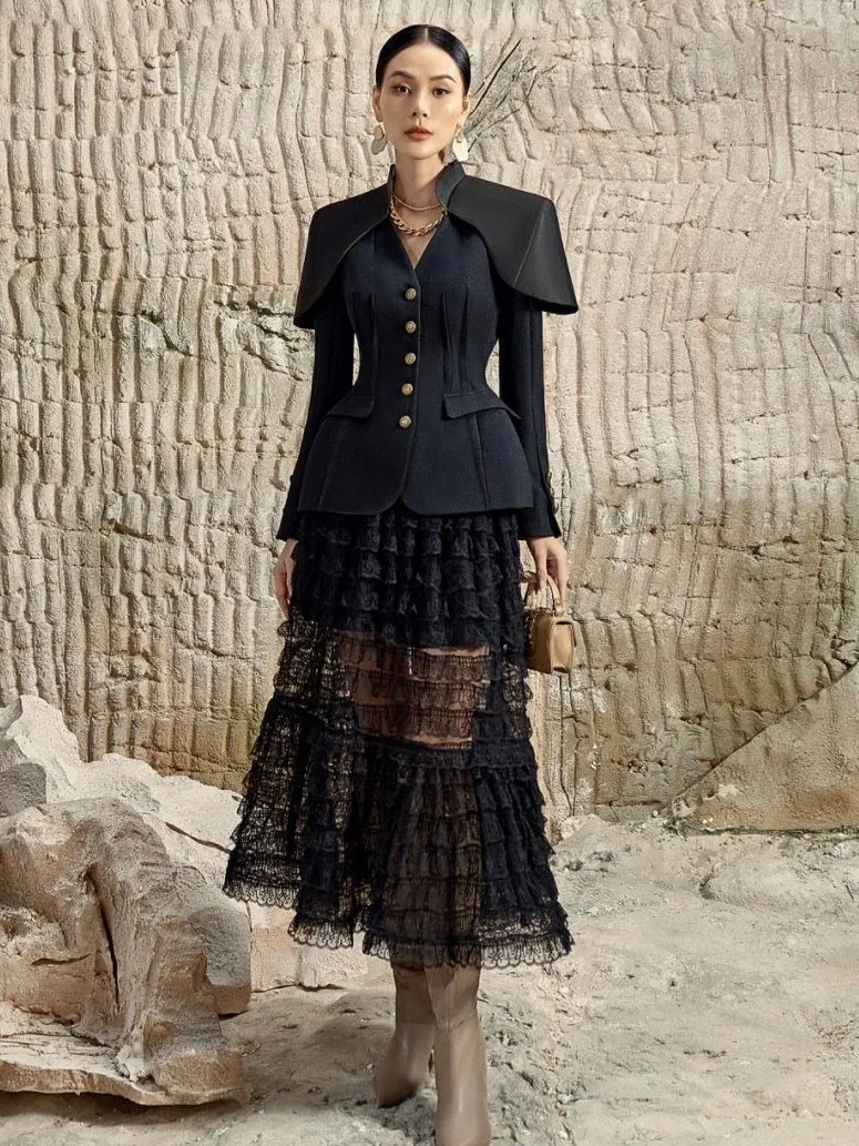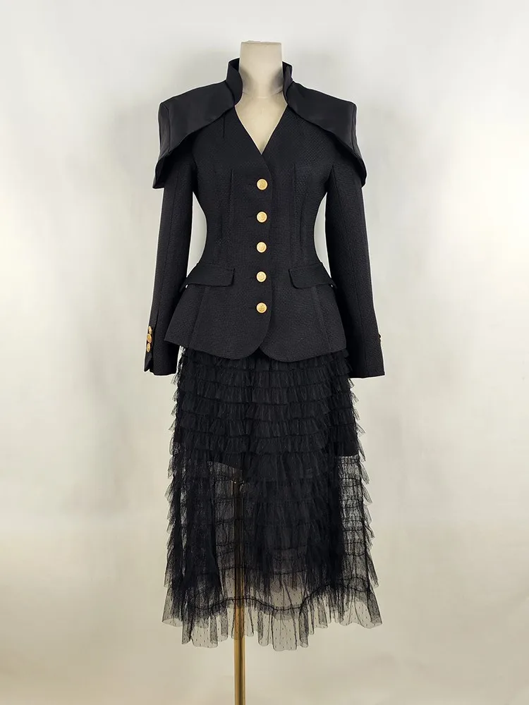 Product Name: Women’s High Quality Khaki Black Pleated Cake Dress with V-Neck and Shoulder Pad New Arrival Two-Piece Party Jacket Dress Set